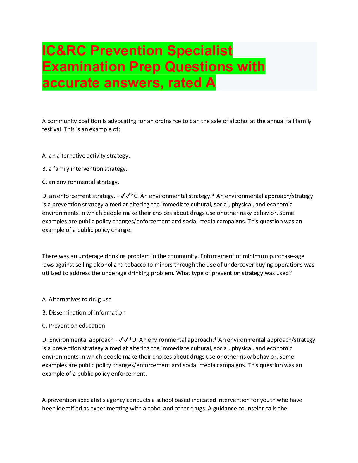 Social Sciences > QUESTIONS & ANSWERS > IC&RC Prevention Specialist Examination Prep Questions with accurate answers, rated A (All)