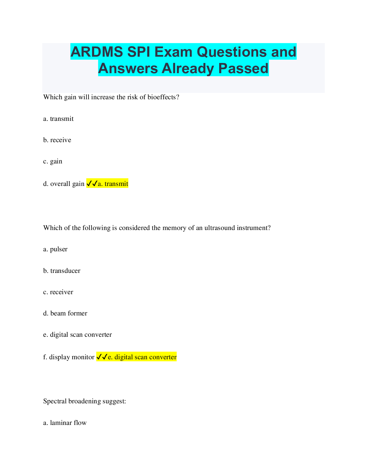 Social Sciences > QUESTIONS & ANSWERS > SPI Practice (ARDMS A & B) Questions and Answers Already Graded A (All)
