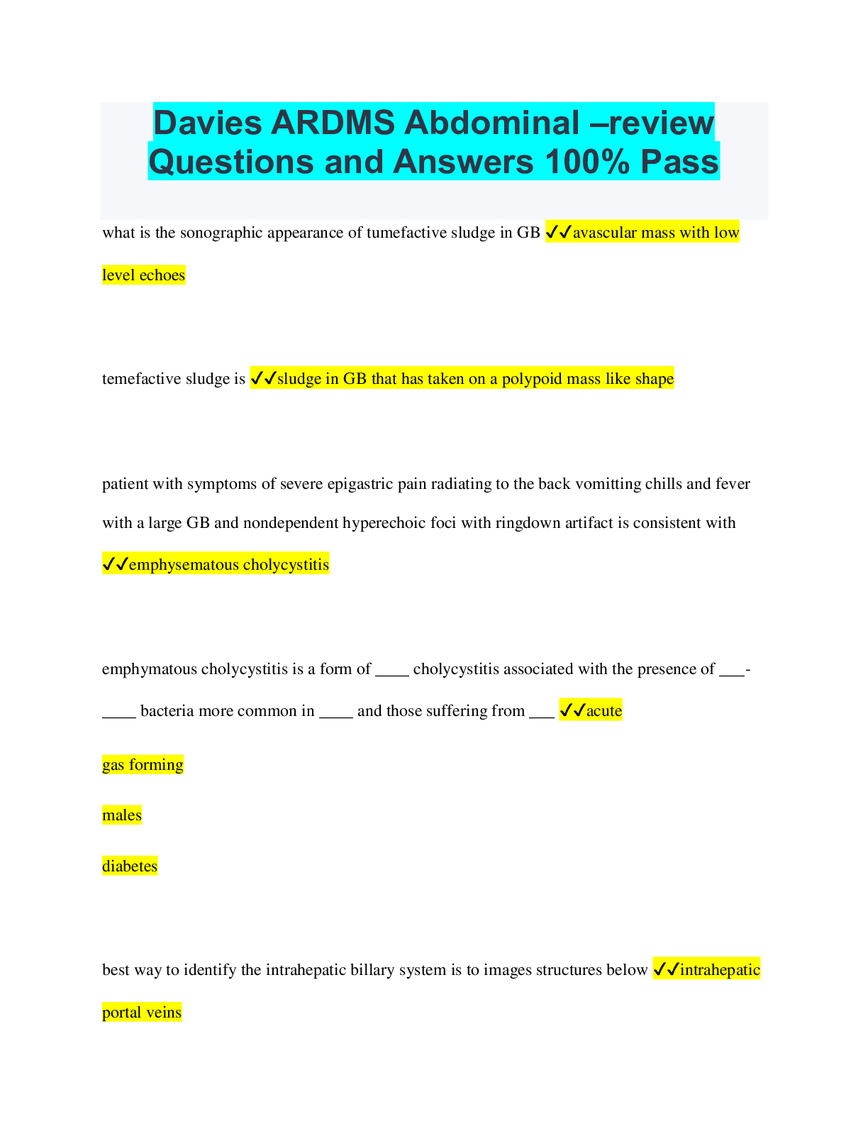 Social Sciences > QUESTIONS & ANSWERS > Davies ARDMS Abdominal –review Questions and Answers 100% Pass (All)