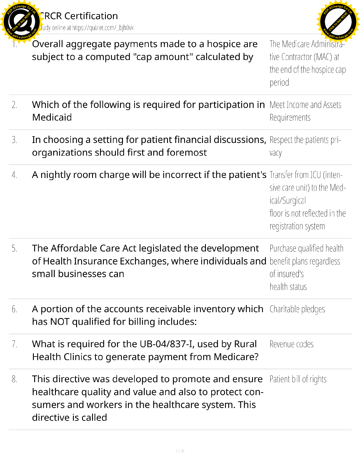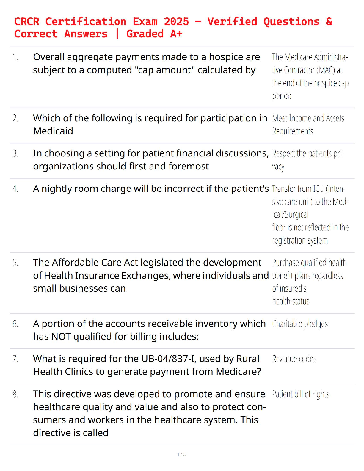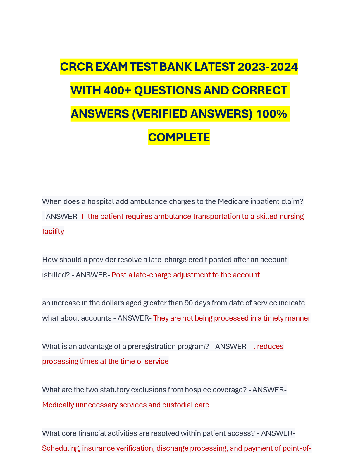 CRCR > QUESTIONS & ANSWERS > CRCR Certification 2024 / HFMA Exam Prep / 400+ Revenue Cycle Questions / Pass Guarantee (All)