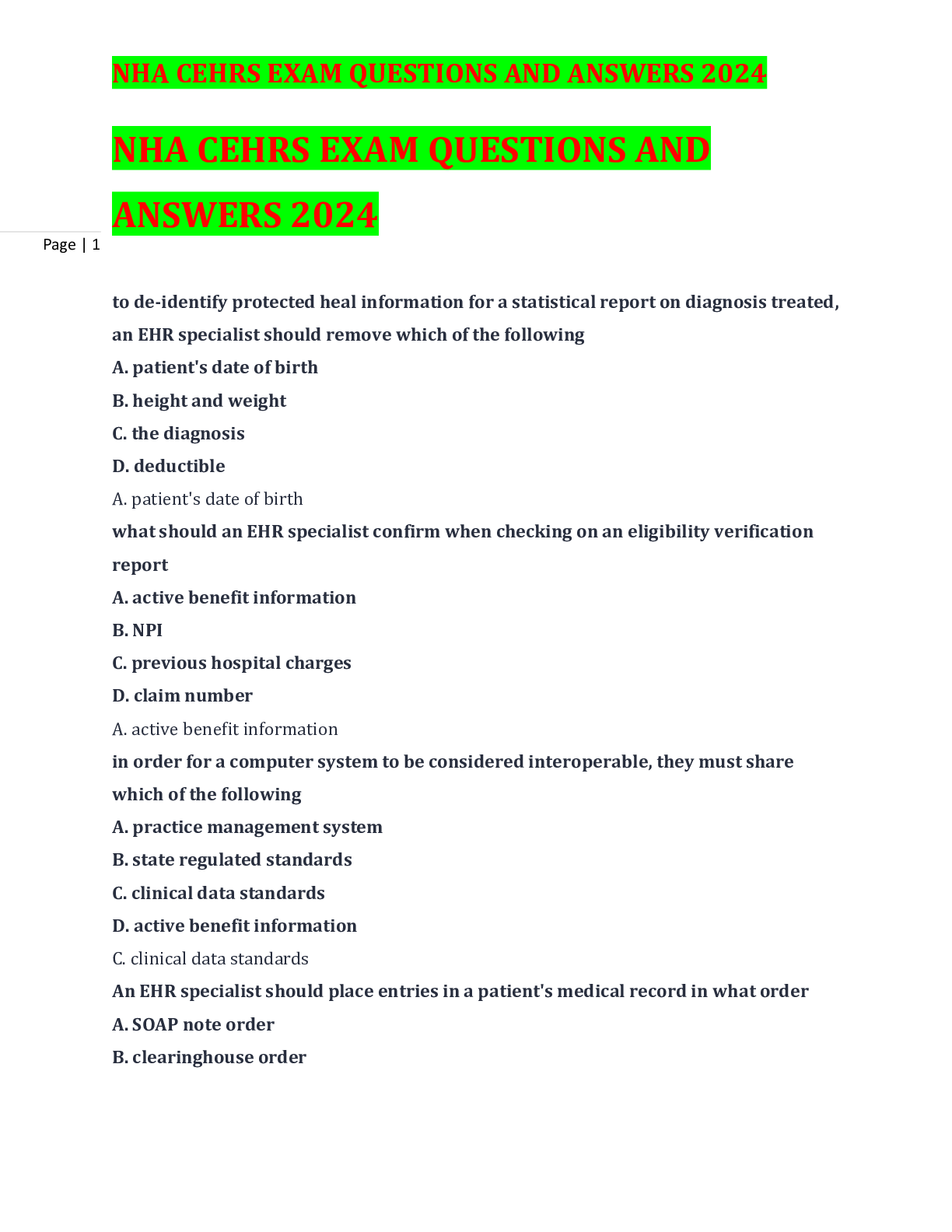 NHA CET > EXAM > NHA CEHRS EXAM QUESTIONS AND ANSWERS 2024 (All)