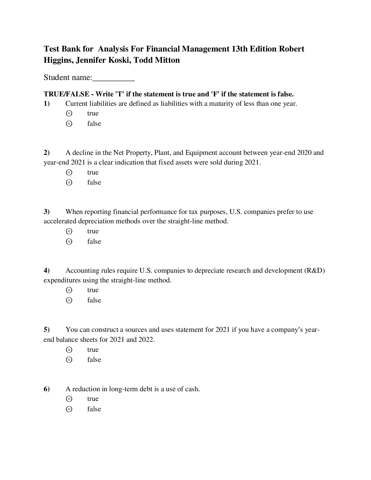 WGU C214 Financial Management > TEST BANKS > Test Bank for Analysis For Financial Management 13th Edition Robert Higgins, Jennifer Koski, Todd Mitton A+ 2025 (All)