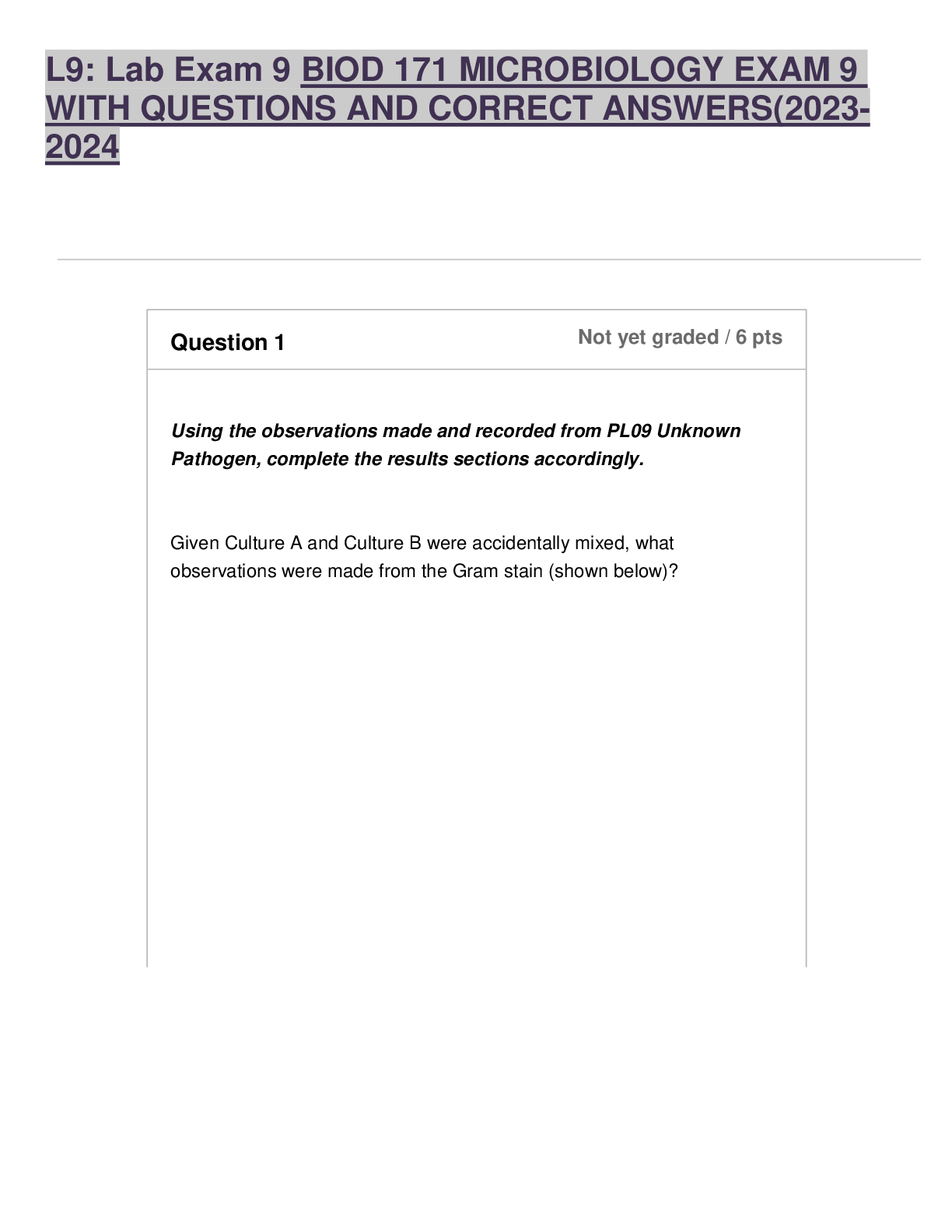 Microbiology > EXAM > BIOD 171 MICROBIOLOGY EXAM 9 WITH QUESTIONS AND CORRECT ANSWERS(2023-2024 (All)