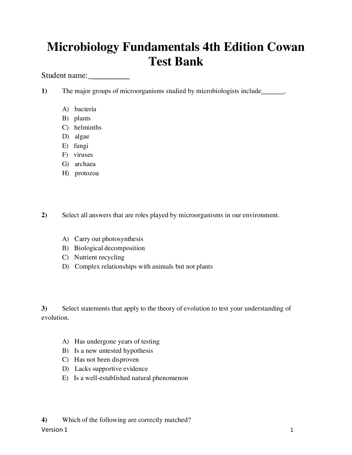 Microbiology > TEST BANKS > Microbiology Fundamentals: A Clinical Approach 4th Edition by Kelly Cowan, Smith, Lusk | TEST BANK (All)