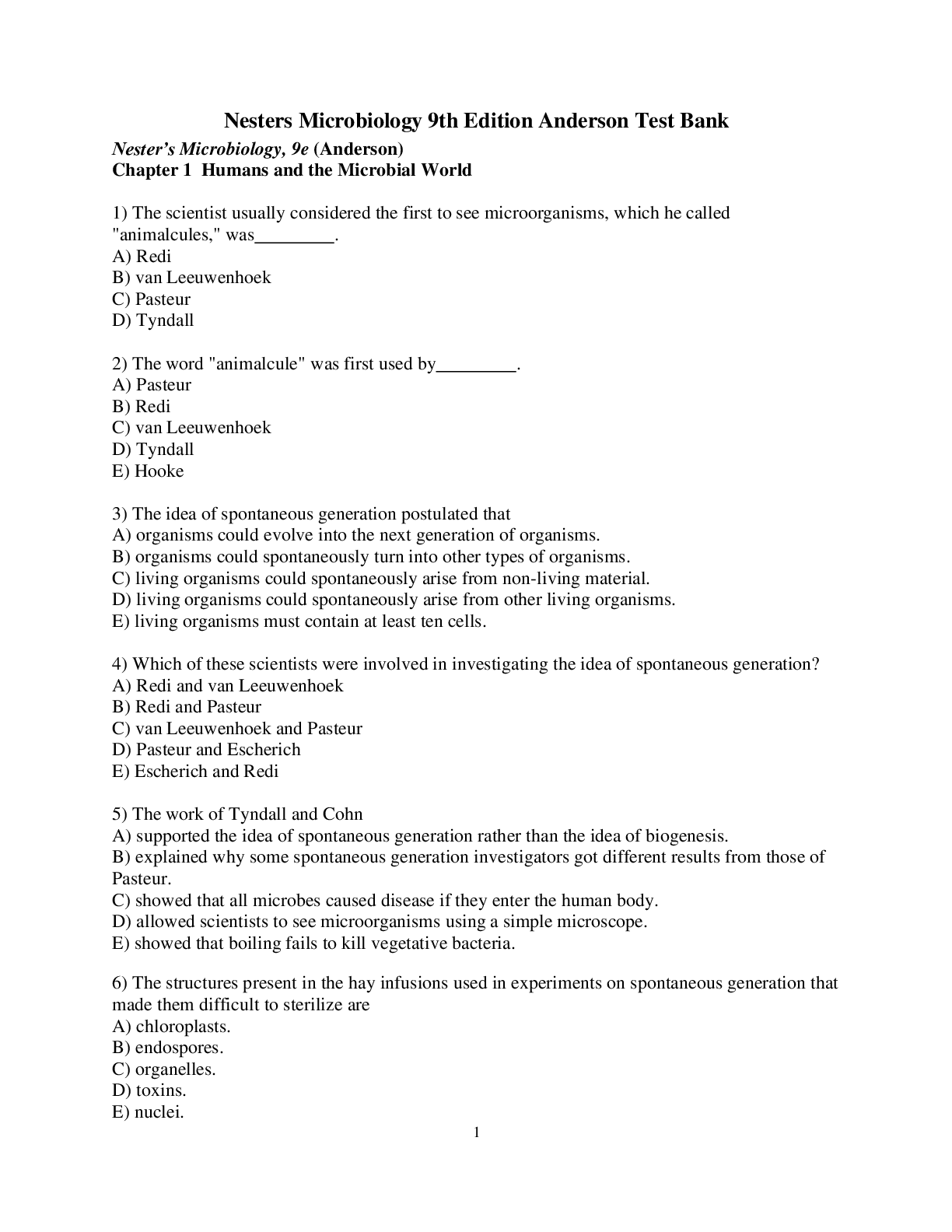 Microbiology > TEST BANKS > Nester's Microbiology: A Human Perspective 9th Edition by Anderson, Salm, Deborah Allen TEST BANK (All)