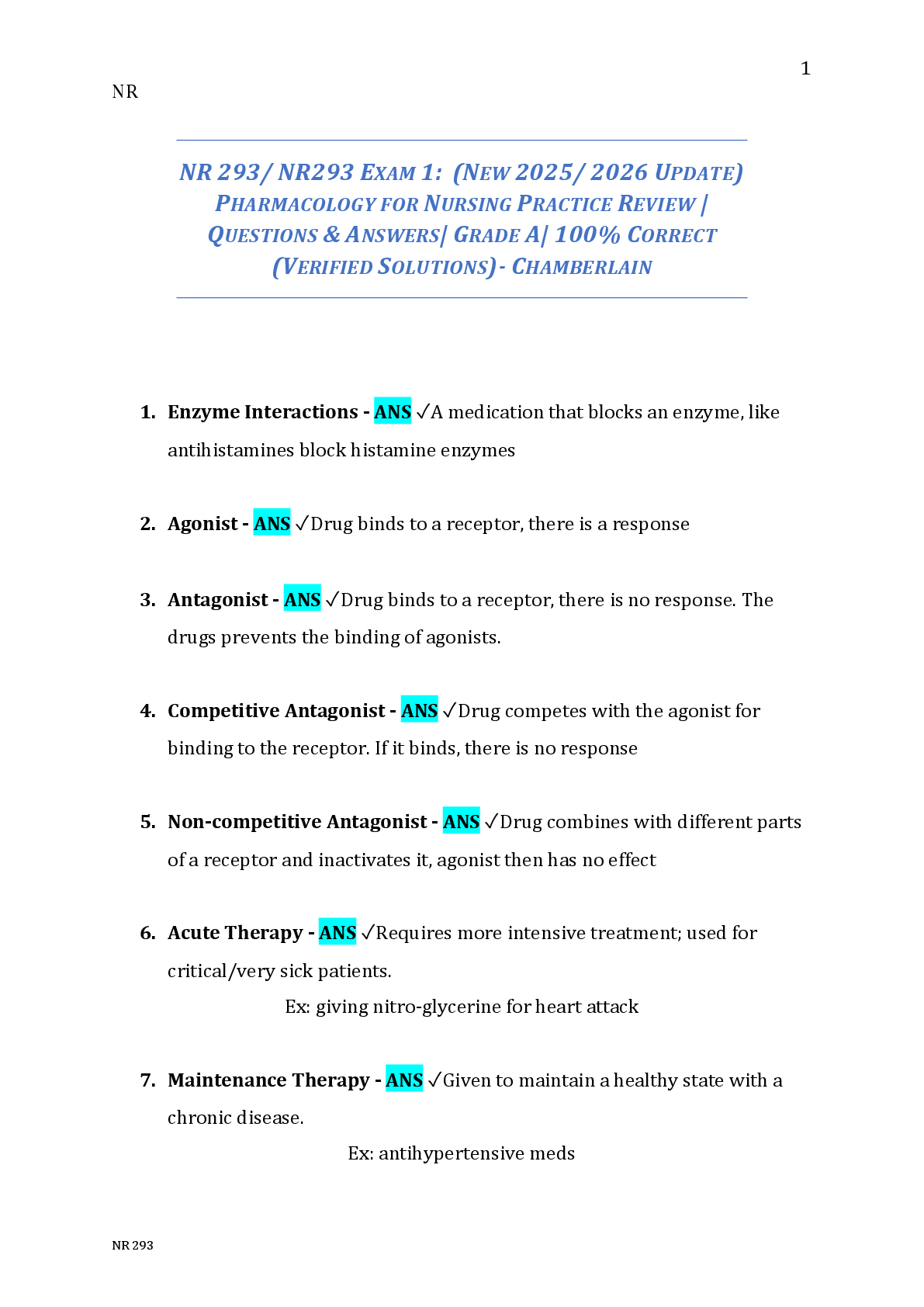 ATI RN PHARMACOLOGY > EXAM > NR 293 NR293 EXAM 1(NEW 2025- 2026 UPDATE) PHARMACOLOGY FOR NURSING PRACTICE REVIEW QUESTIONS & ANSWERS GRADE A 100% CORRECT (VERIFIED SOLUTIONS)- CHAMBERLAIN (All)