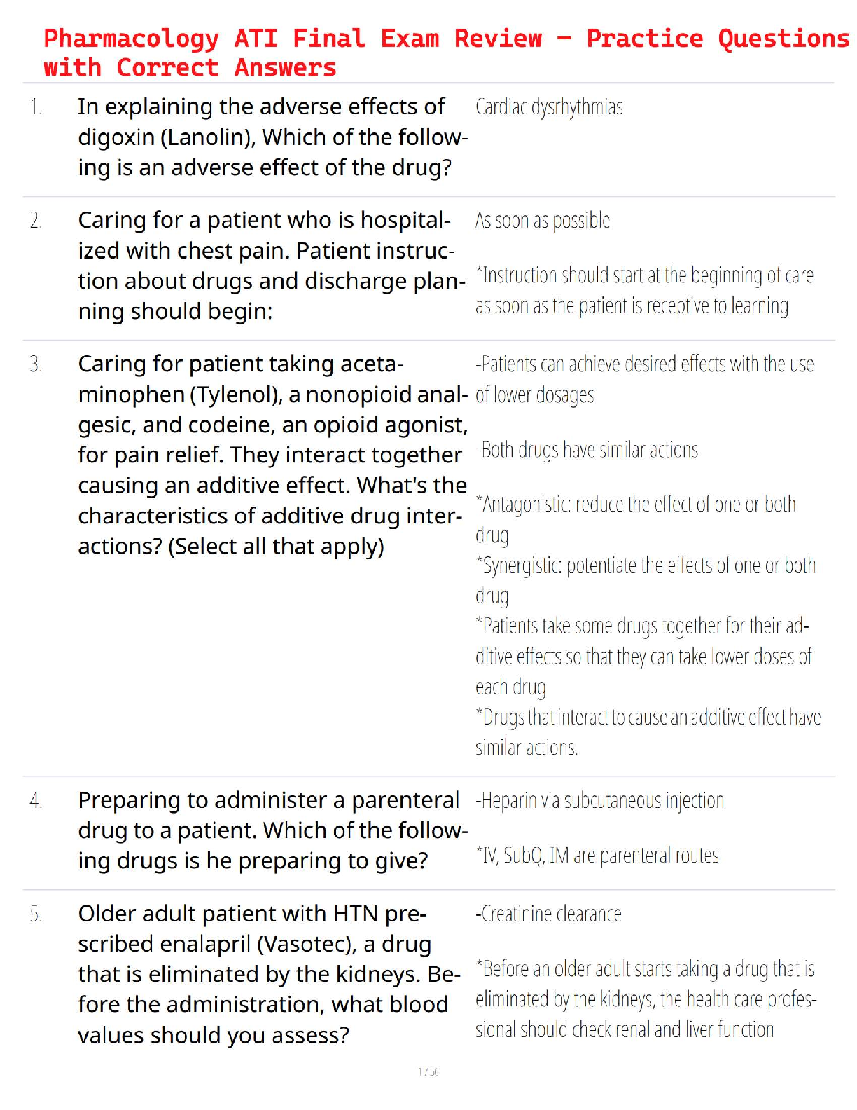 ATI RN PHARMACOLOGY > QUESTIONS & ANSWERS > Pharmacology ATI Final Exam Review – Practice Questions with Correct Answers (All)