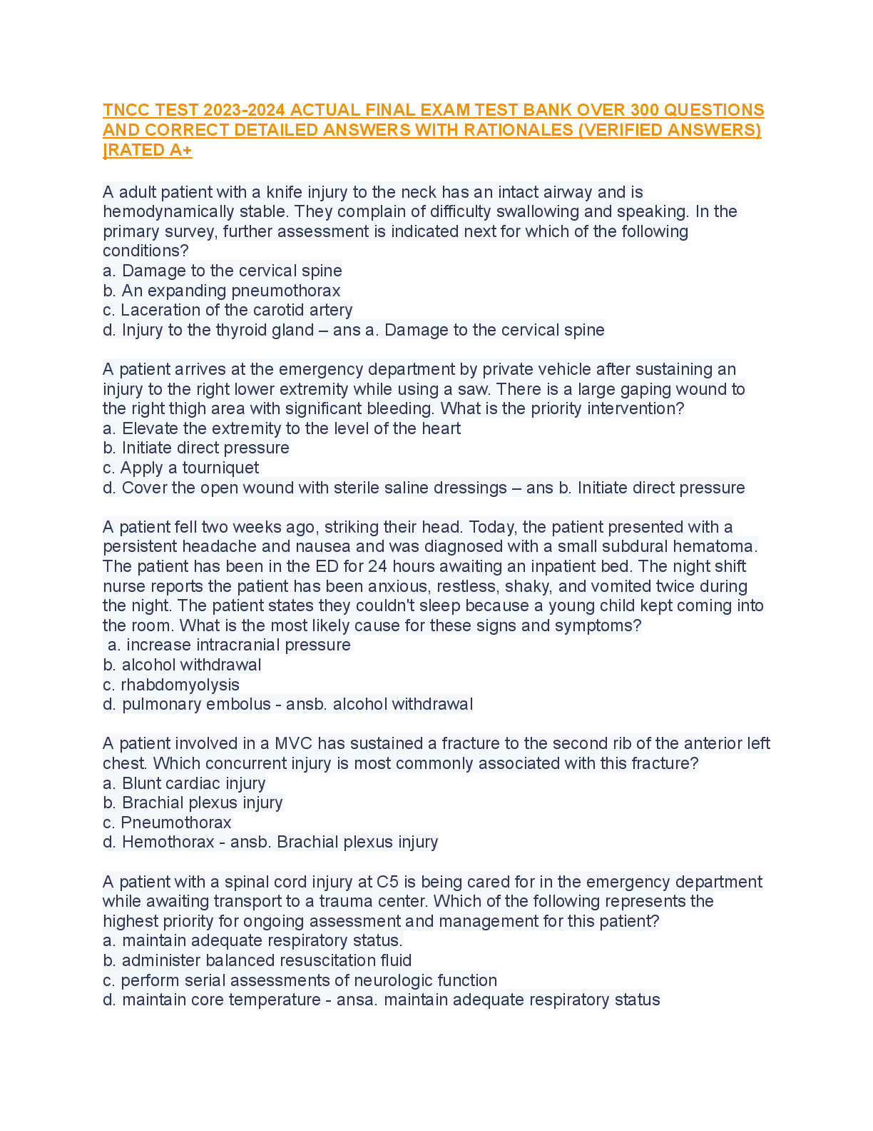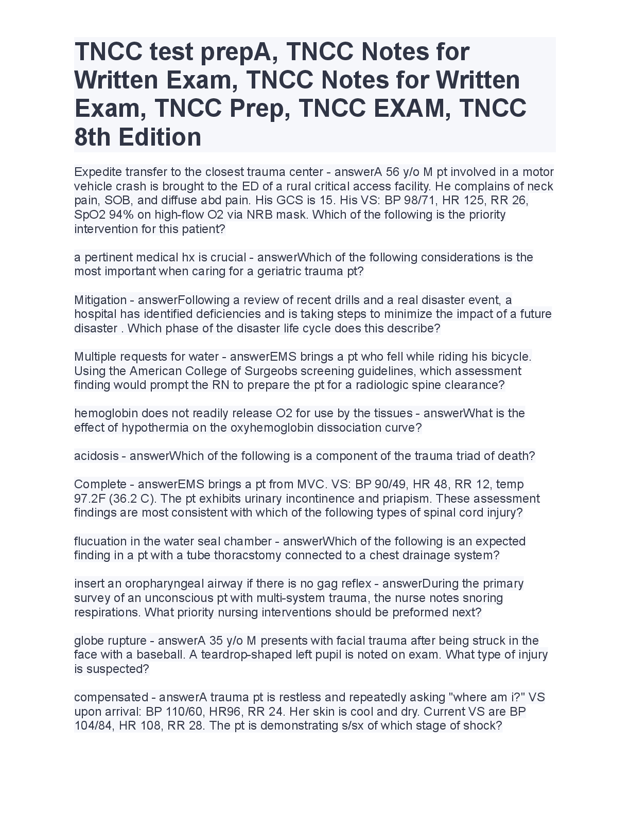 TNCC EXAM > TEST BANKS > TNCC test prepA, TNCC Notes for Written Exam, TNCC Notes for Written Exam, TNCC Prep, TNCC EXAM, TNCC 8th Edition A+ (All)