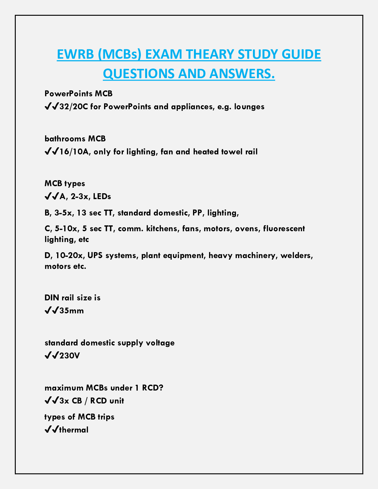 Electrical Engineering > EXAM > EWRB (MCBs) EXAM THEARY STUDY GUIDE QUESTIONS AND ANSWERS. (All)