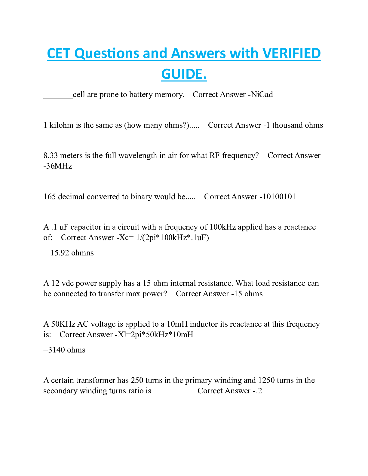 Electrical Engineering > EXAM > CET Questions and Answers with VERIFIED GUIDE (All)