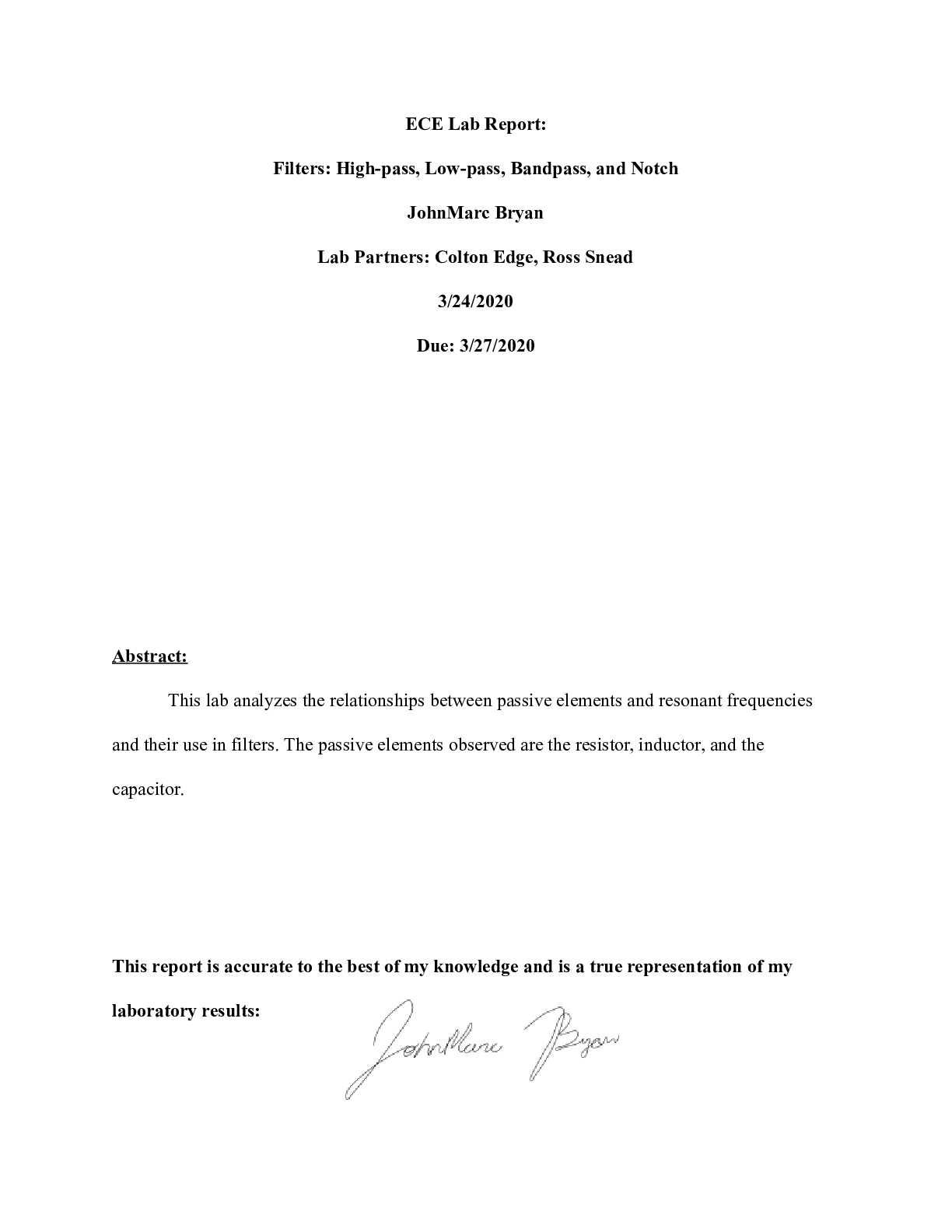 Electrical Engineering > Lab Report > ECE Lab Report: Filters: High-pass, Low-pass, Bandpass, and Notch (All)