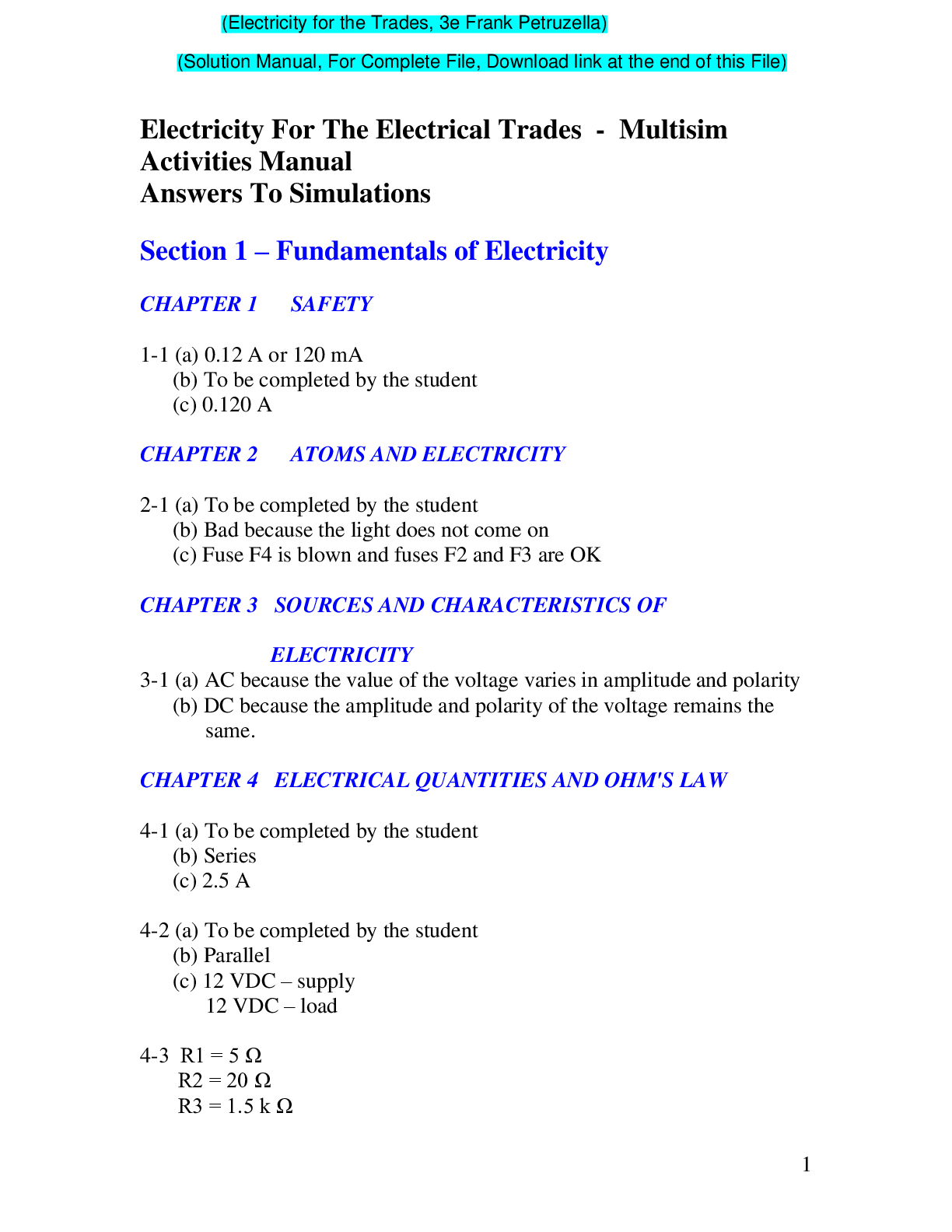 Electrical Engineering > SOLUTIONS MANUAL > Electricity for the Trades, 3e Frank Petruzella (Solution Manual) (All)