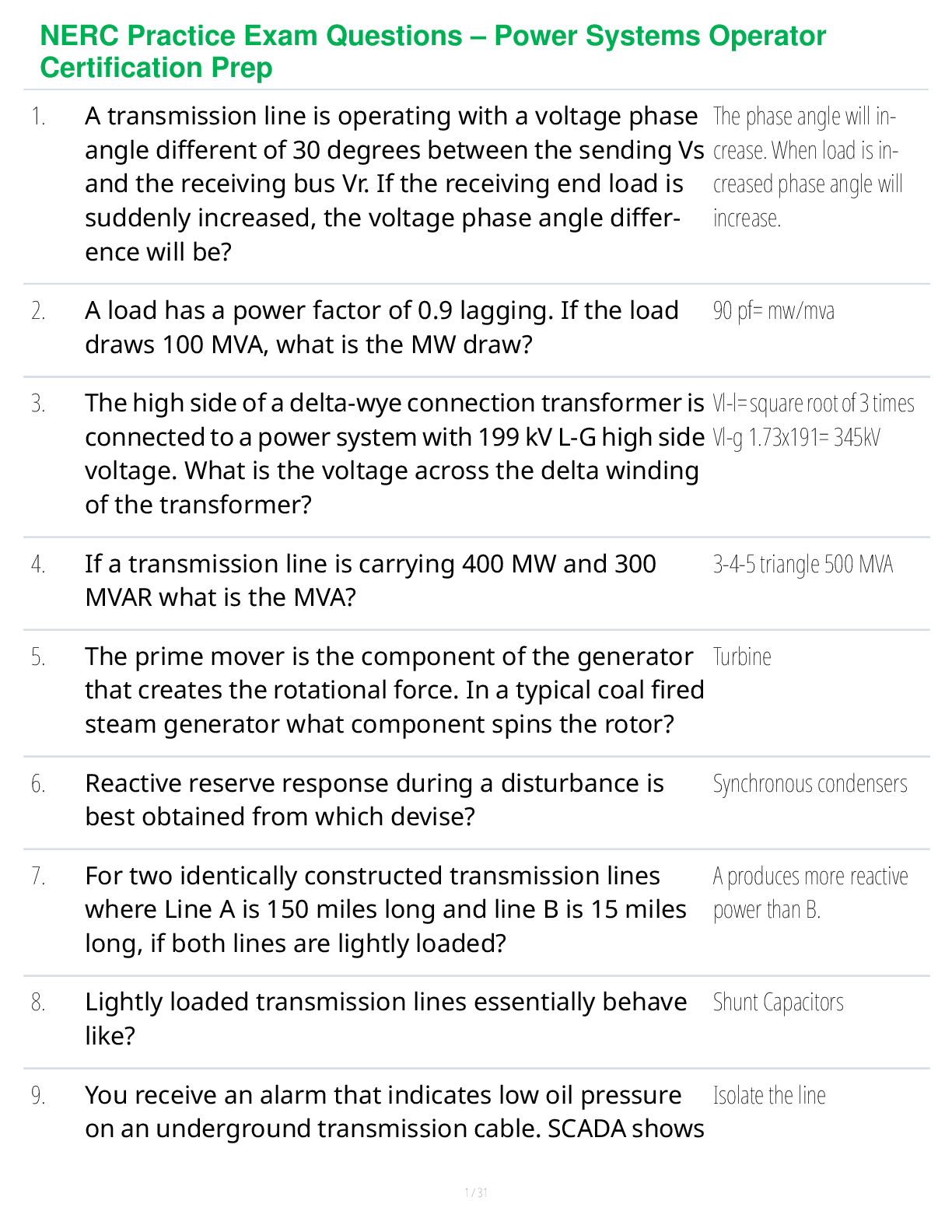 Electrical Engineering > STUDY GUIDE > NERC Practice Exam Questions – Power Systems Operator Certification Prep (All)