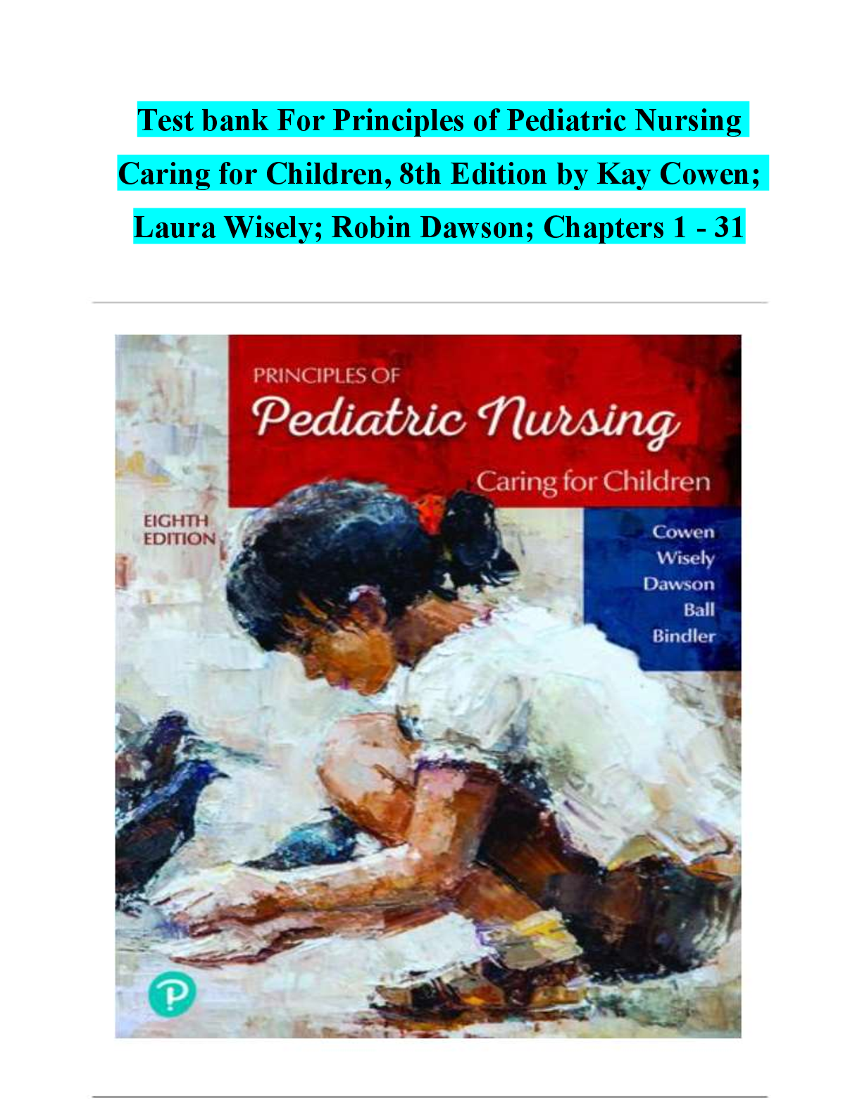 PEDIATRIC NURSING > TEST BANKS > Test bank For Principles of Pediatric Nursing Caring for Children, 8th Edition by Kay Cowen; Laura Wisely; Robin Dawson; Chapters 1 - 31 (All)