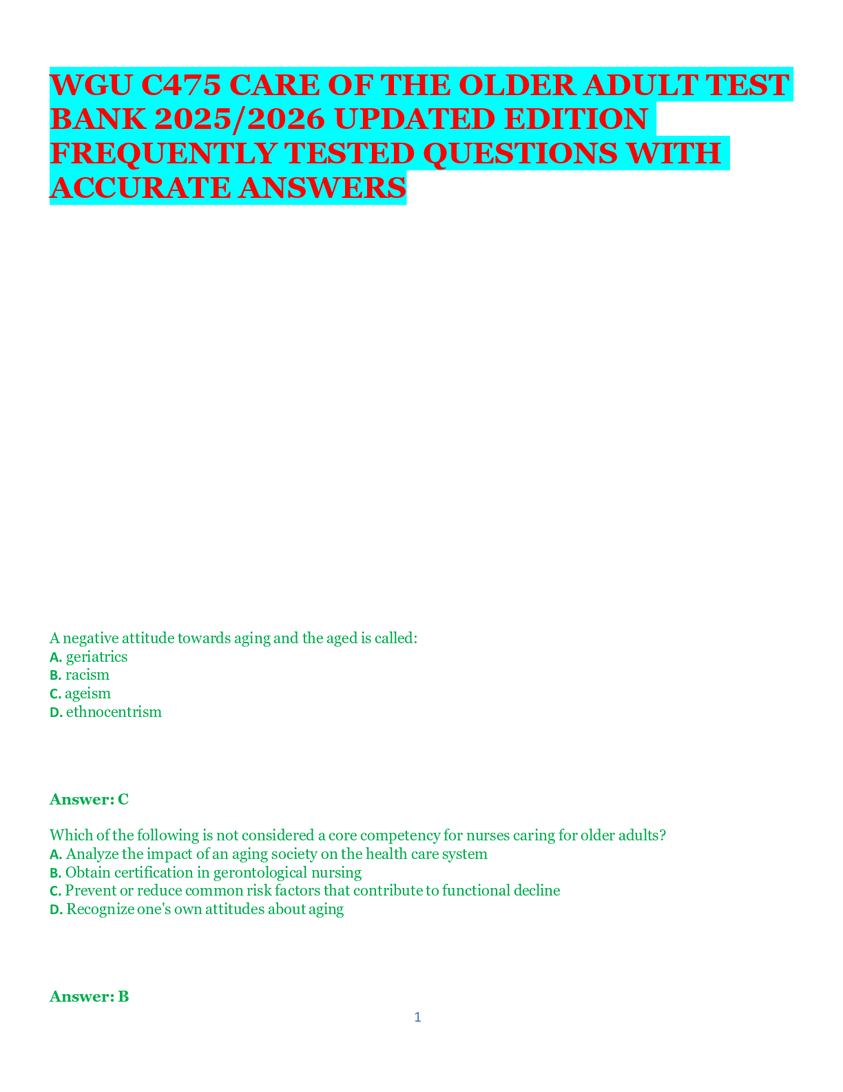 CRITICAL CARE NURSING > TEST BANKS > WGU C475 CARE OF THE OLDER ADULT TEST BANK 2025/2026 UPDATED EDITION FREQUENTLY TESTED QUESTIONS WITH ACCURATE ANSWERS (All)