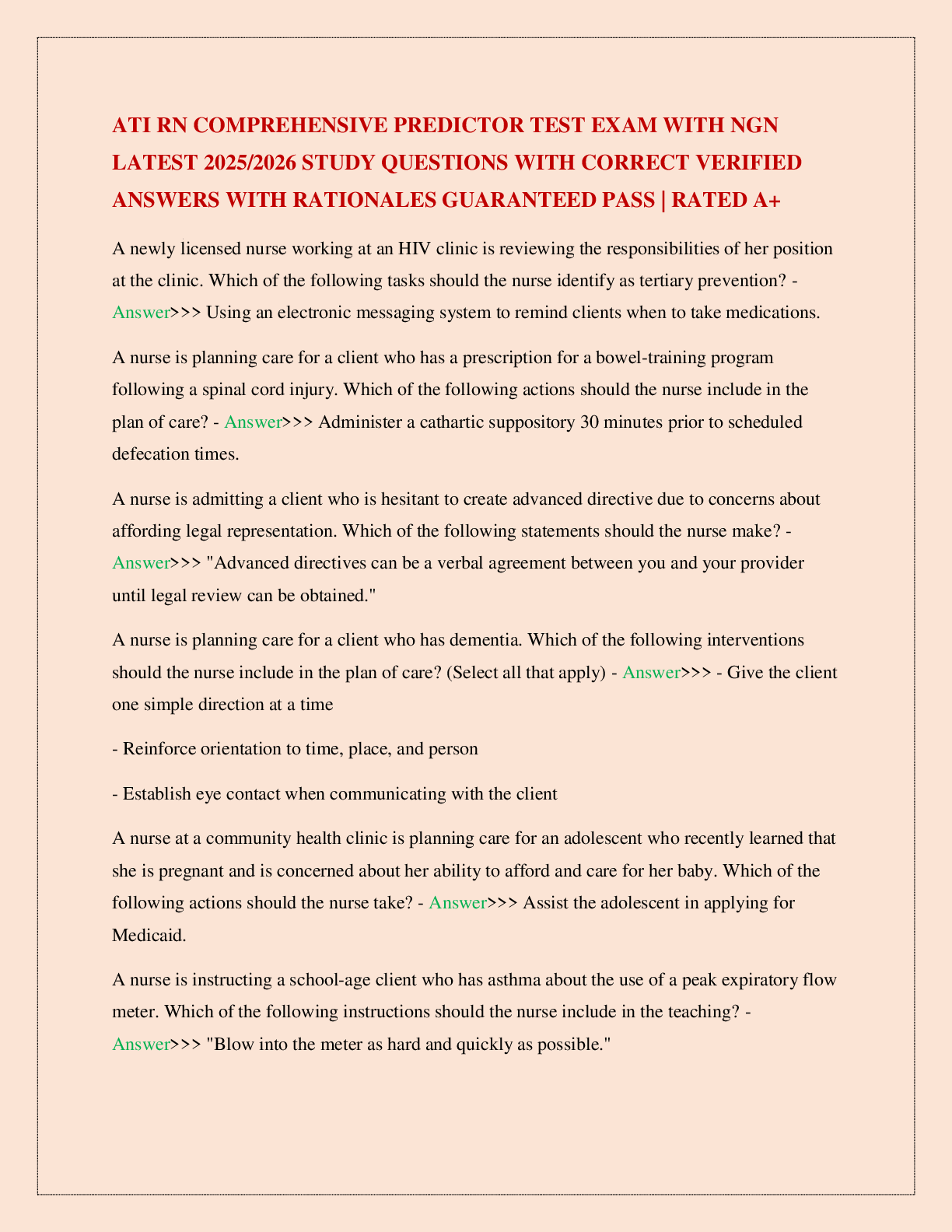 ATI RN COMPREHENSIVE PREDICTOR > FINAL EXAM > 2025-26 ATI RN COMPREHENSIVE PREDICTOR RETAKE EXAM QUESTIONS & VERIFIED CORRECT ANSWERS 2025 ( UPDATED) A+GRADE (All)