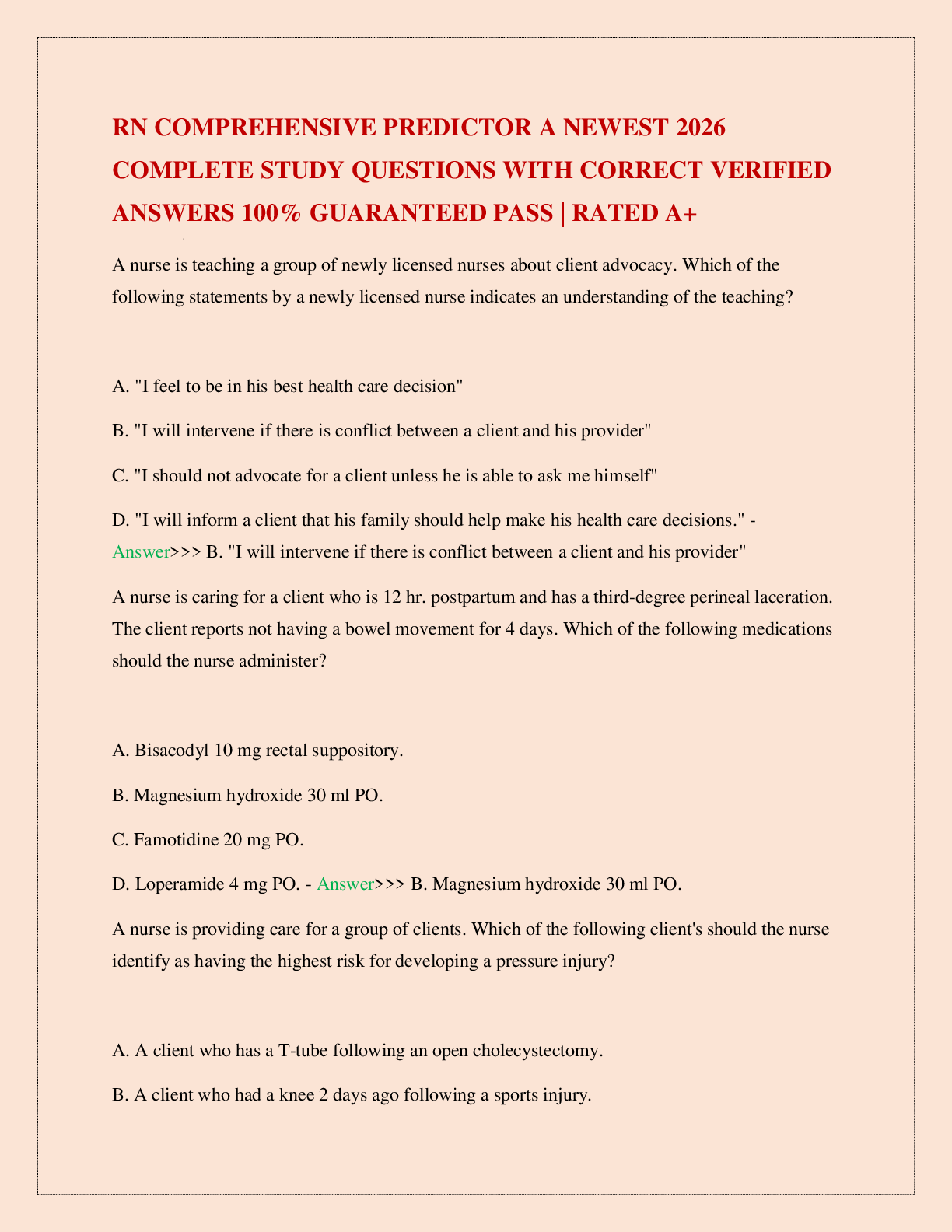 ATI RN COMPREHENSIVE PREDICTOR > EXAM > RN COMPREHENSIVE PREDICTOR A NEWEST 2026 COMPLETE STUDY QUESTIONS WITH CORRECT VERIFIED ANSWERS 100% GUARANTEED PASS | RATED A+ (All)