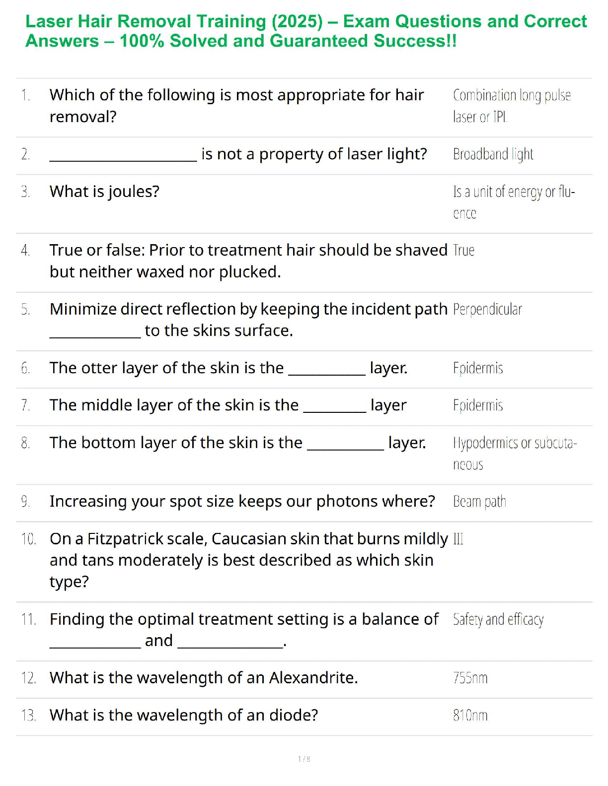 TDLR Esthetics > STUDY GUIDE > Laser Hair Removal Training (2025) – Exam Questions and Correct Answers – 100% Solved and Guaranteed Success!! (All)