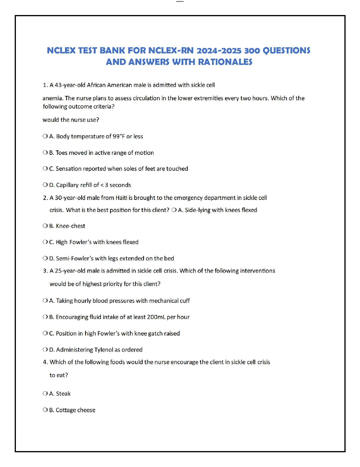 HESI NCLEX-RN Fundamentals > QUESTIONS and ANSWERS > NCLEX-RN Test Bank 2024–2025 – 300 Practice Questions with Correct Answers & Rationales (All)