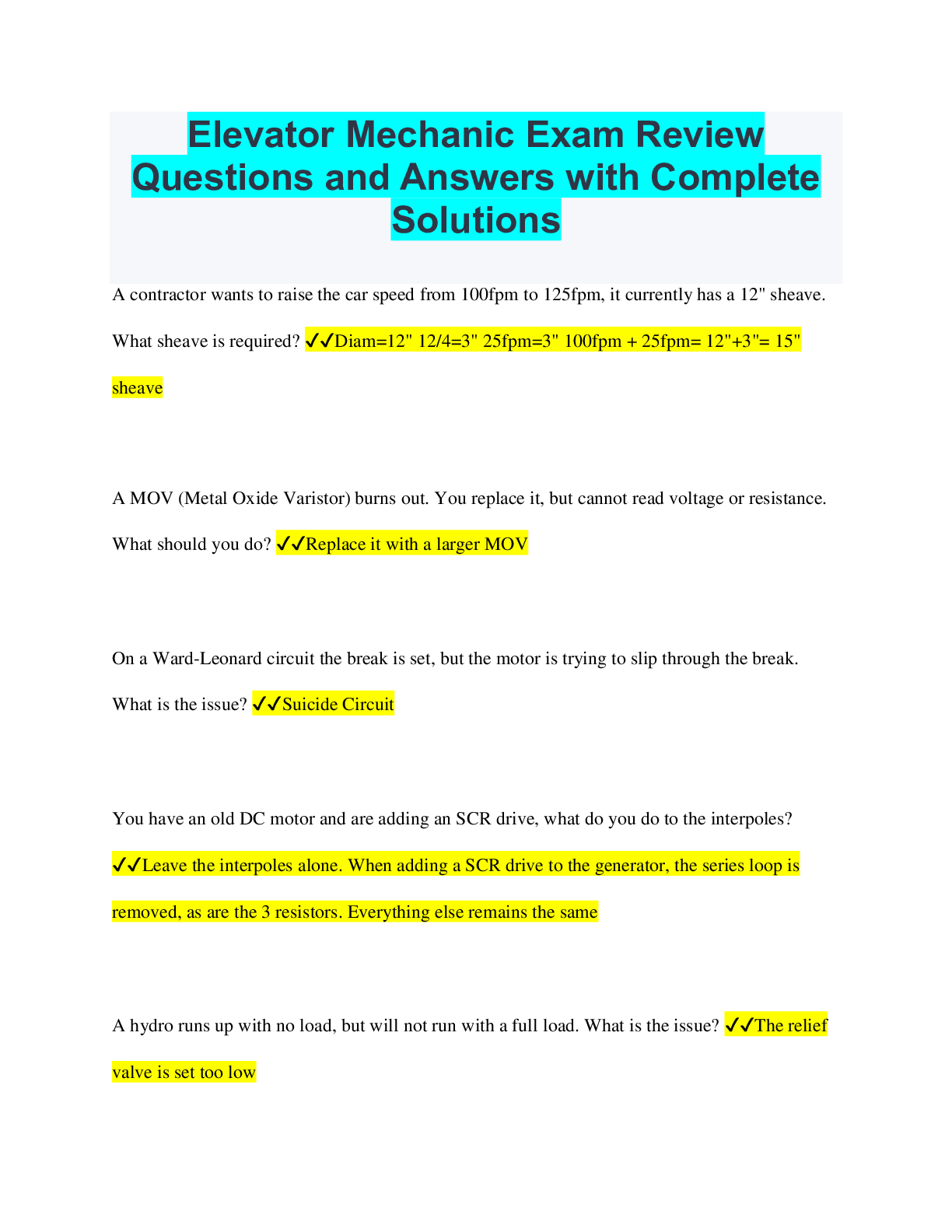 Mechanical Engineering > QUESTIONS & ANSWERS > Elevator final exam questions and answers already passed (All)