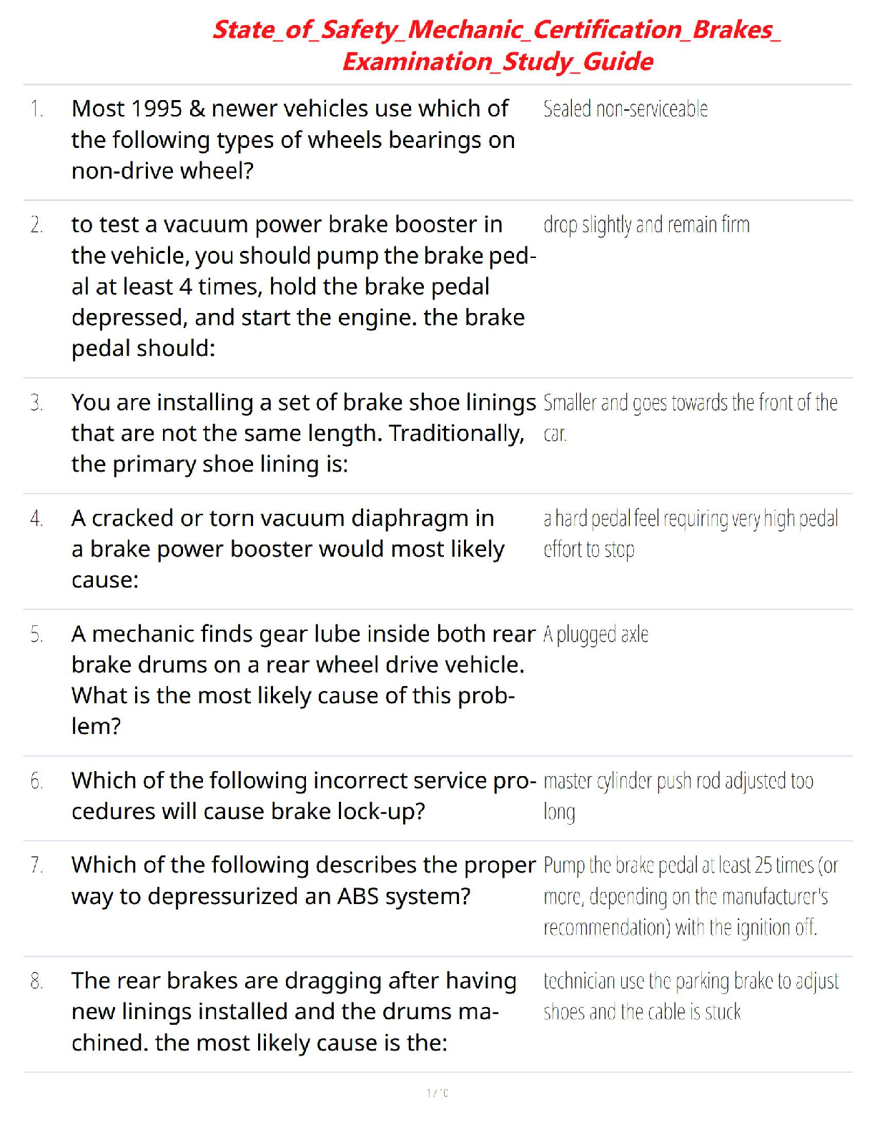 Mechanical Engineering > STUDY GUIDE > State of Safety Mechanic Certification Brakes Examination Study Guide (All)