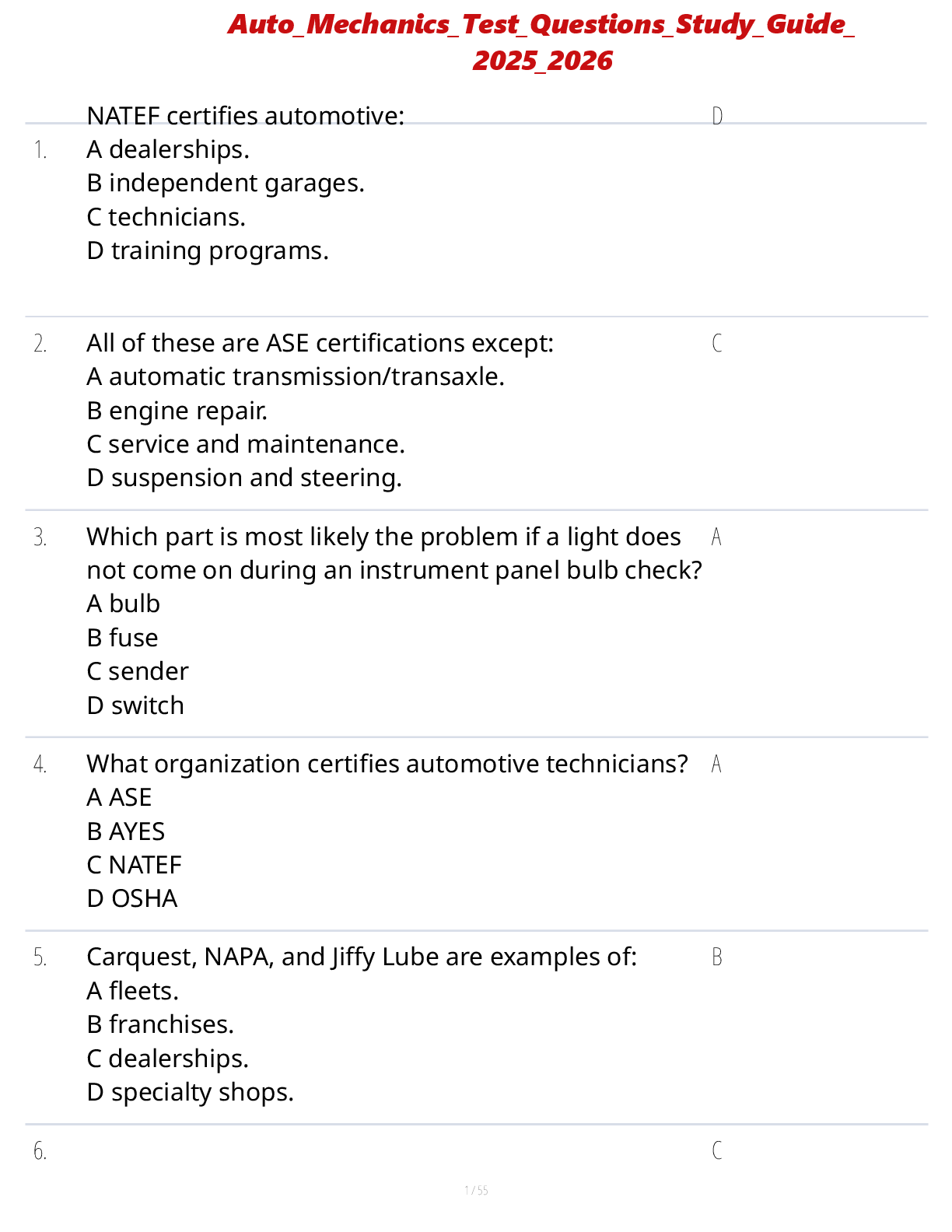Mechanical Engineering > STUDY GUIDE > Auto Mechanics Test Questions Study Guide 2025 (All)