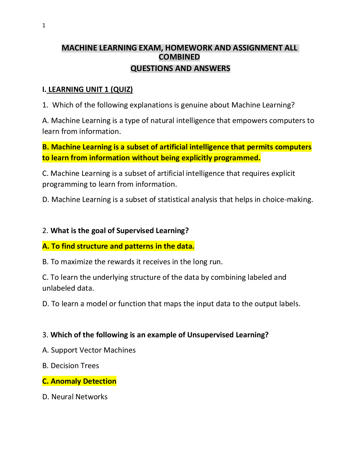 Mechanical Engineering > AQA QUESTION and MARK SCHEMES > MACHINE LEARNING EXAM, HOMEWORK AND ASSIGNMENT ALL COMBINED QUESTIONS AND ANSWERS (All)