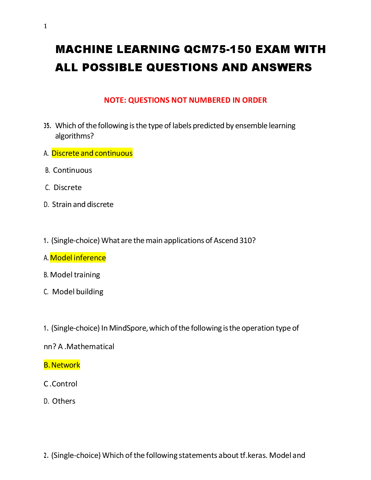 Mechanical Engineering > AQA QUESTION and MARK SCHEMES > MACHINE LEARNING QCM75-150 EXAM WITH ALL POSSIBLE QUESTIONS AND ANSWERS (All)