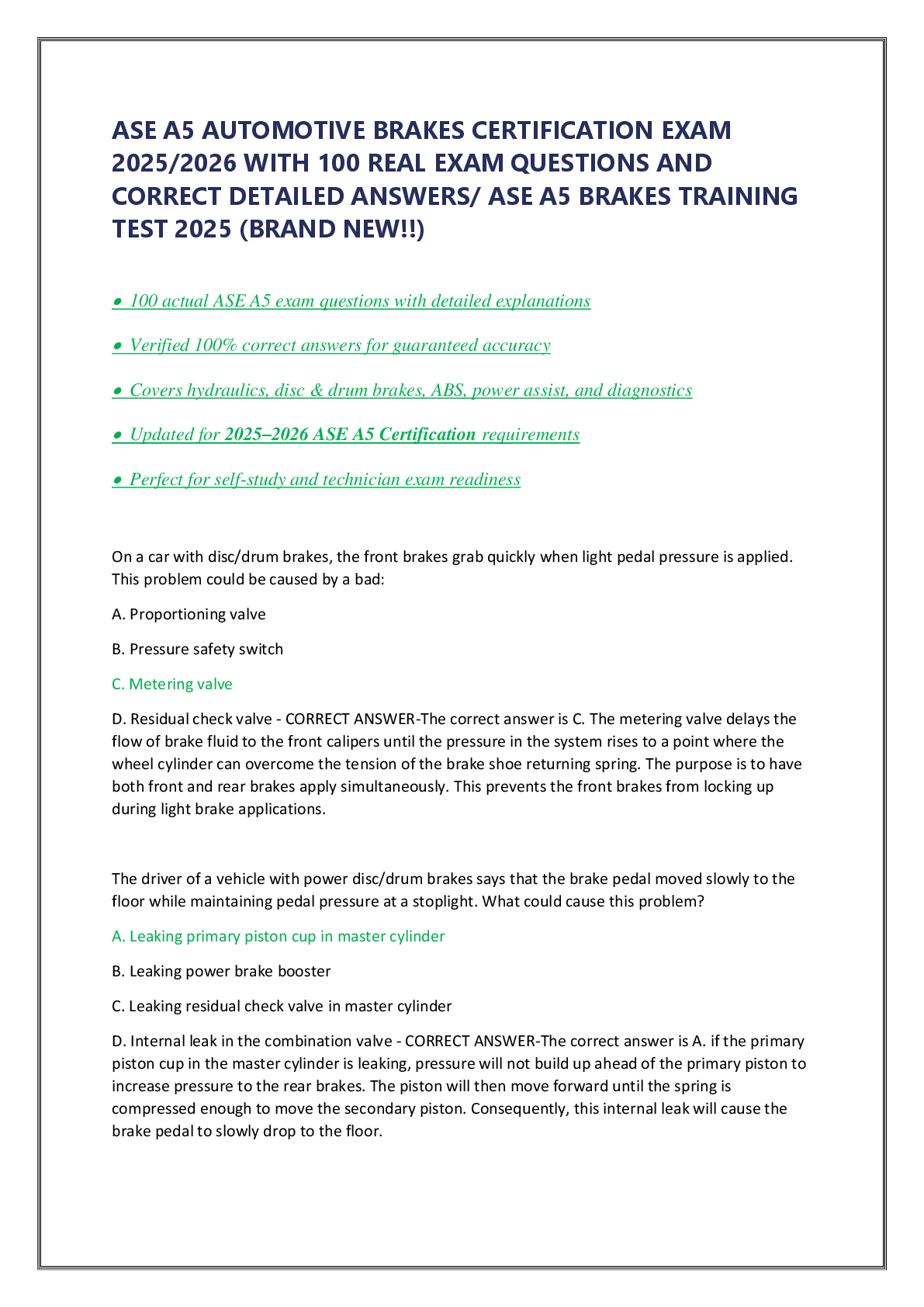 Mechanical Engineering > EXAM > ASE A5 AUTOMOTIVE BRAKES CERTIFICATION EXAM 2025/2026 WITH 100 REAL EXAM QUESTIONS AND CORRECT DETAILED ANSWERS/ ASE A5 BRAKES TRAINING TEST 2025 (BRAND NEW!!) (All)