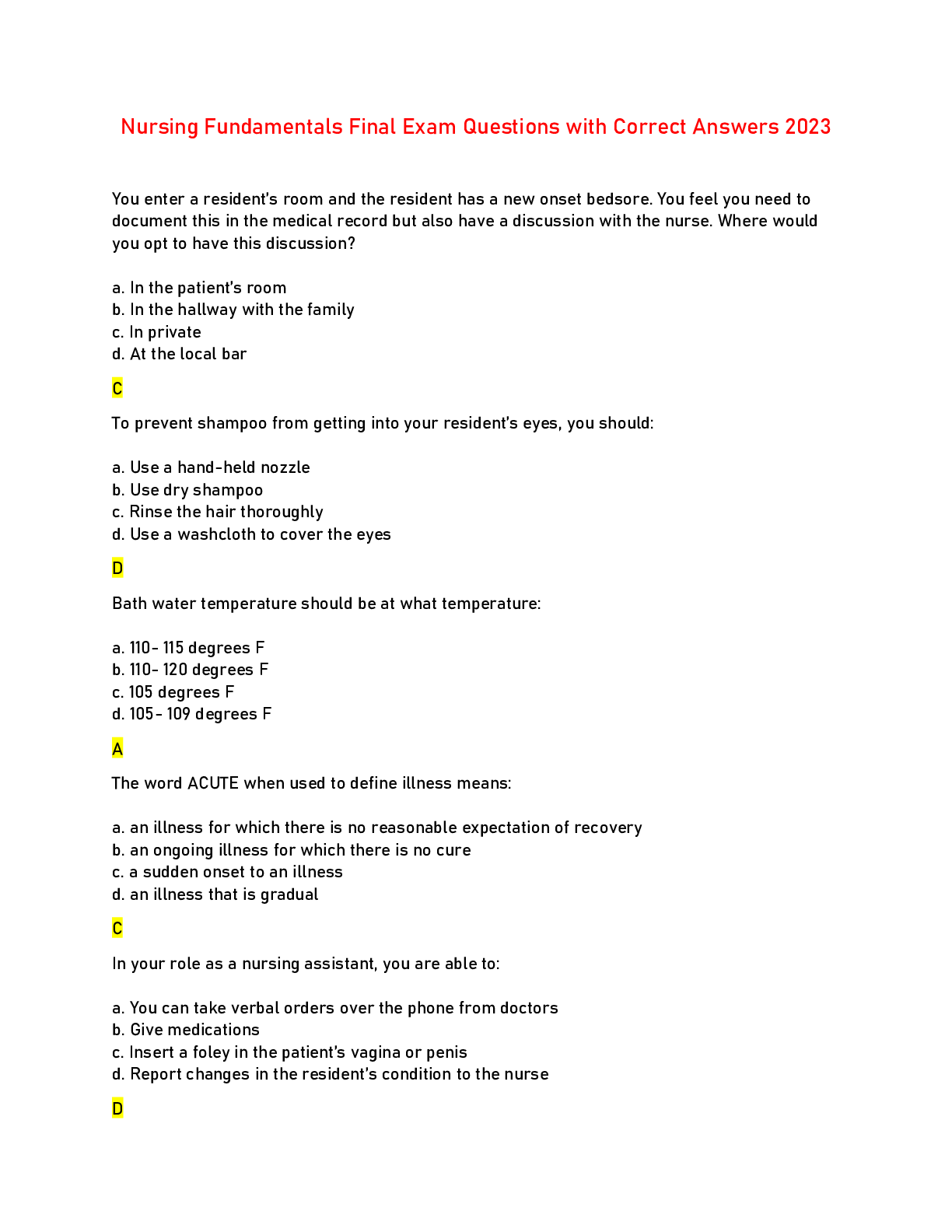 nursing fundamentals > EXAM > Nursing Fundamentals Final Exam Questions with Correct Answers 2023 (All)