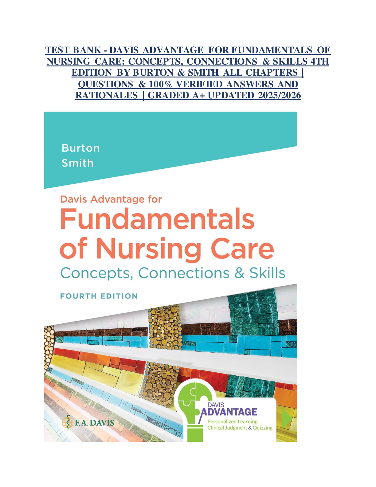 nursing fundamentals > TEST BANKS > TEST BANK - DAVIS ADVANTAGE FOR FUNDAMENTALS OF NURSING CARE: CONCEPTS, CONNECTIONS & SKILLS 4TH EDITION BY BURTON & SMITH ALL CHAPTERS | QUESTIONS & 100% VERIFIED ANSWERS AND RATIONALES | GRADED A+ UPDATED 2025/2026 (All)