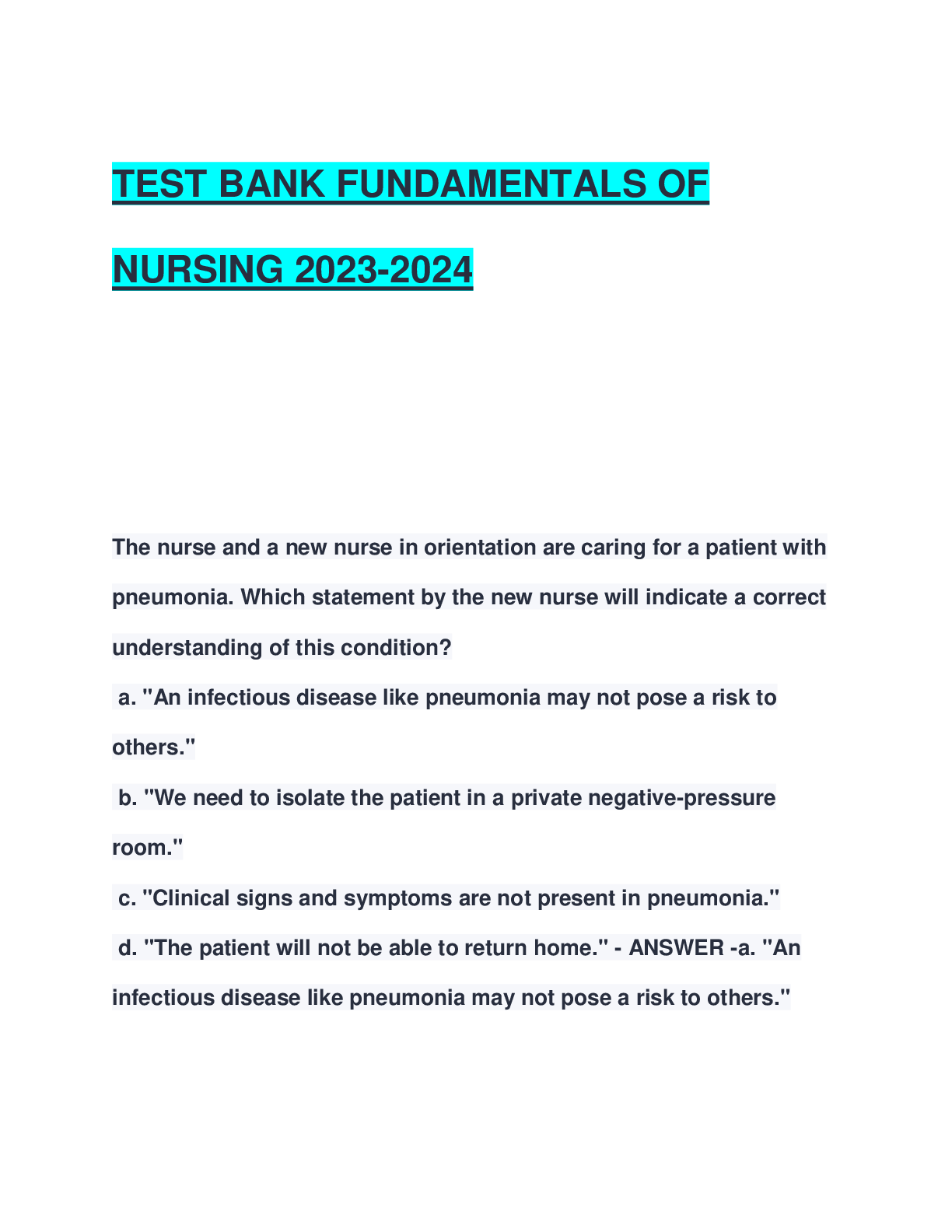 nursing fundamentals > TEST BANKS > NURSING FUNDAMENTALS TEST BANK NEWEST STUDY QUESTIONS 2026 WITH CORRECT VERIFIED ANSWERS 100% GUARANTEED PASS | RATED A+ (All)