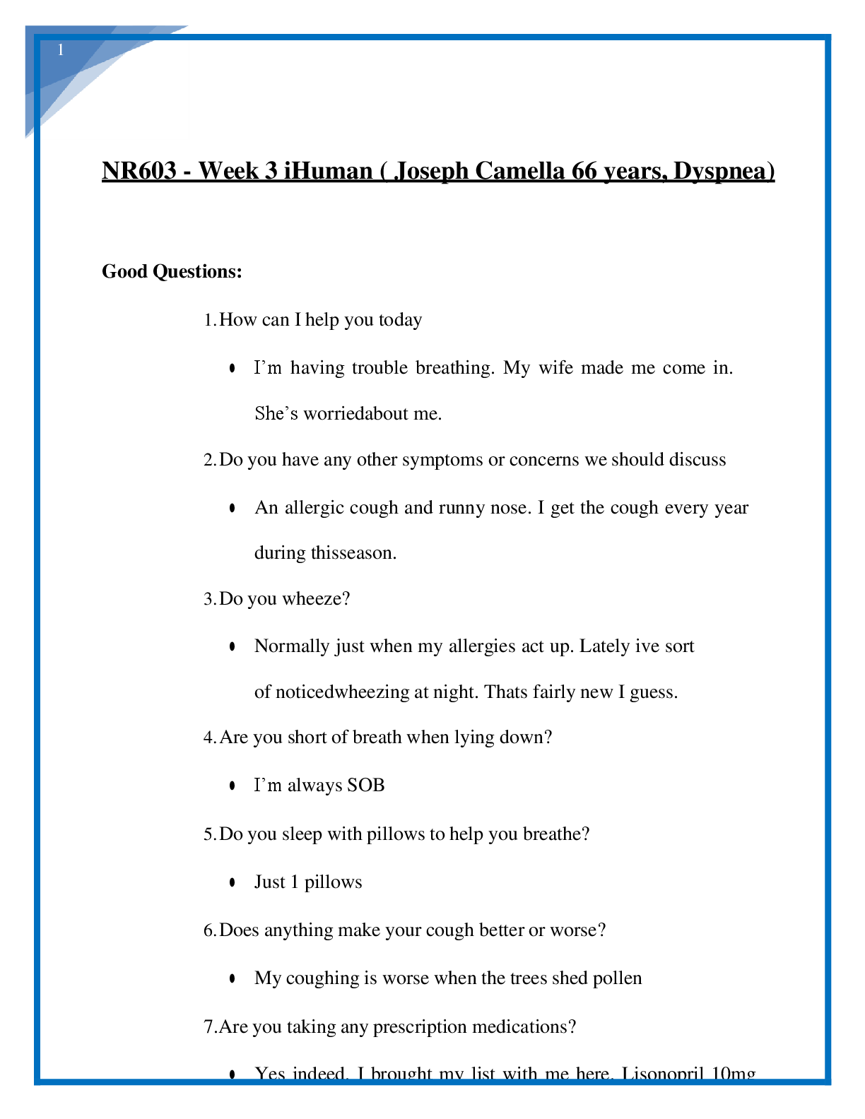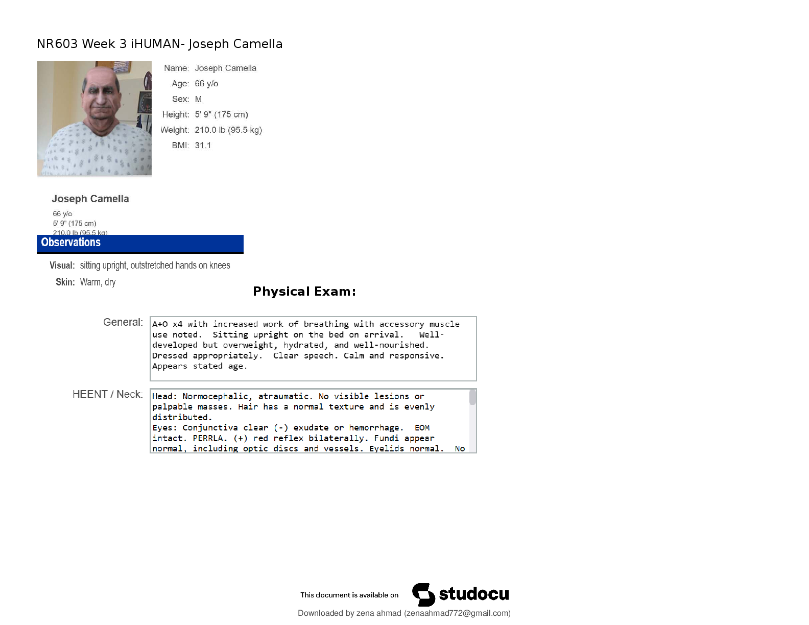 Ihuman case study > EXAM > NR603 - Week 3 iHuman (Joseph Camella 66 years, Dyspnea)-Graded A+ (All)