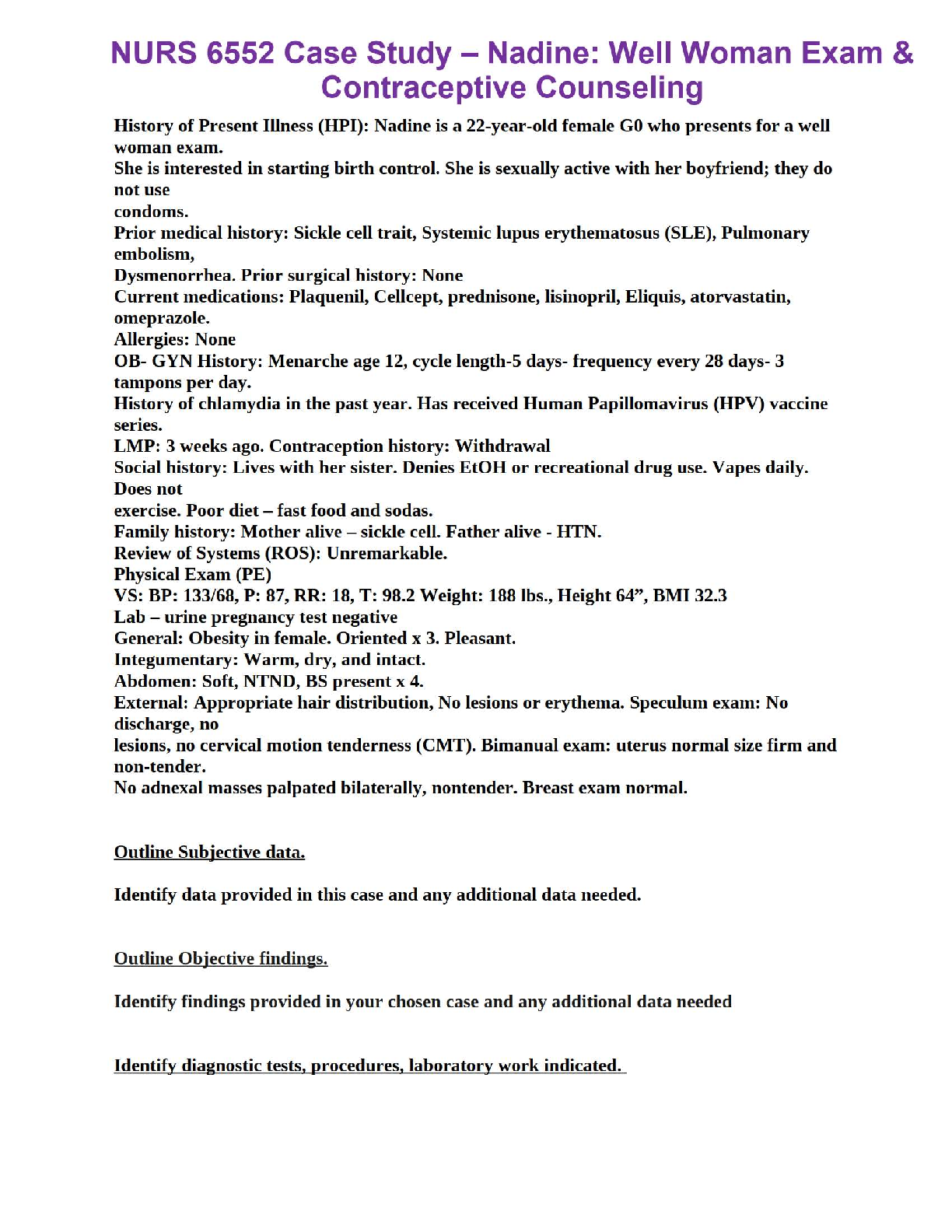 Ihuman case study > CASE STUDY > NURS 6552 Case Study – Nadine: Well Woman Exam & Contraceptive Counseling (All)