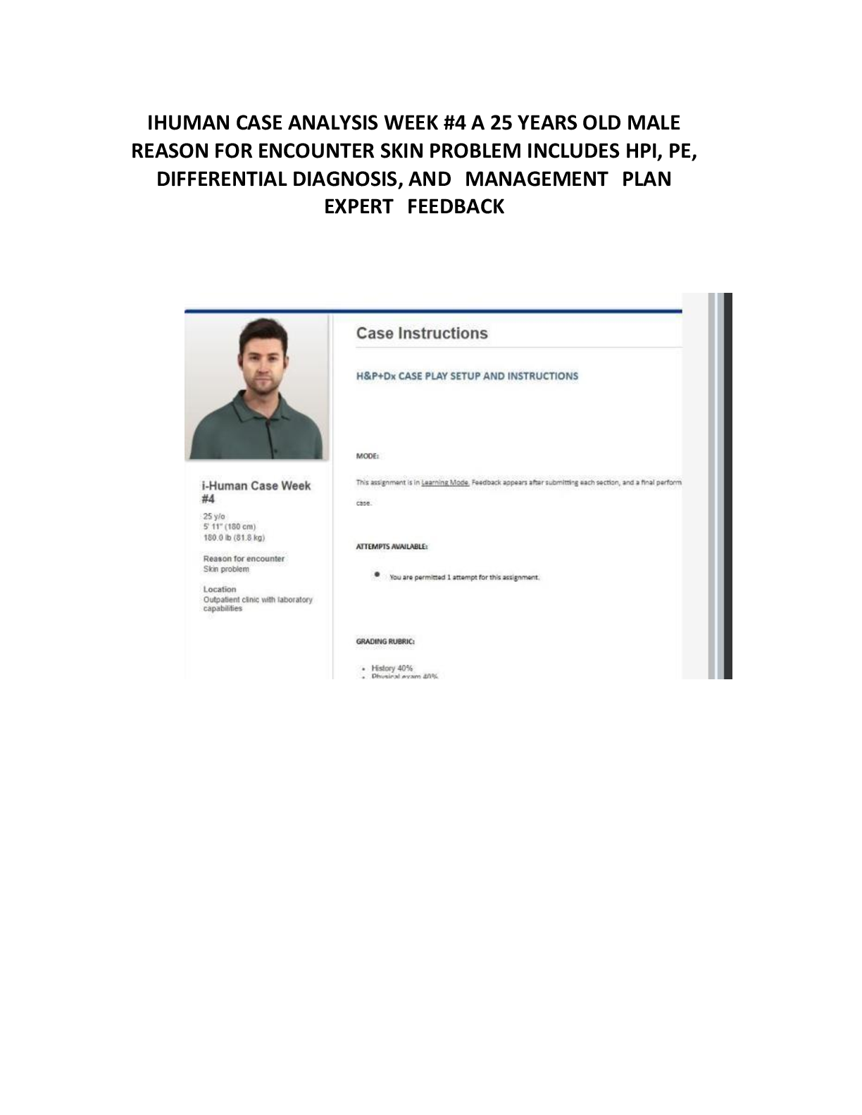 Ihuman case study > CASE STUDY > IHUMAN CASE ANALYSIS WEEK #4 A 25 YEARS OLD MALE REASON FOR ENCOUNTER SKIN PROBLEM INCLUDES HPI, PE, DIFFERENTIAL DIAGNOSIS, AND MANAGEMENT PLAN EXPERT FEEDBACK (All)