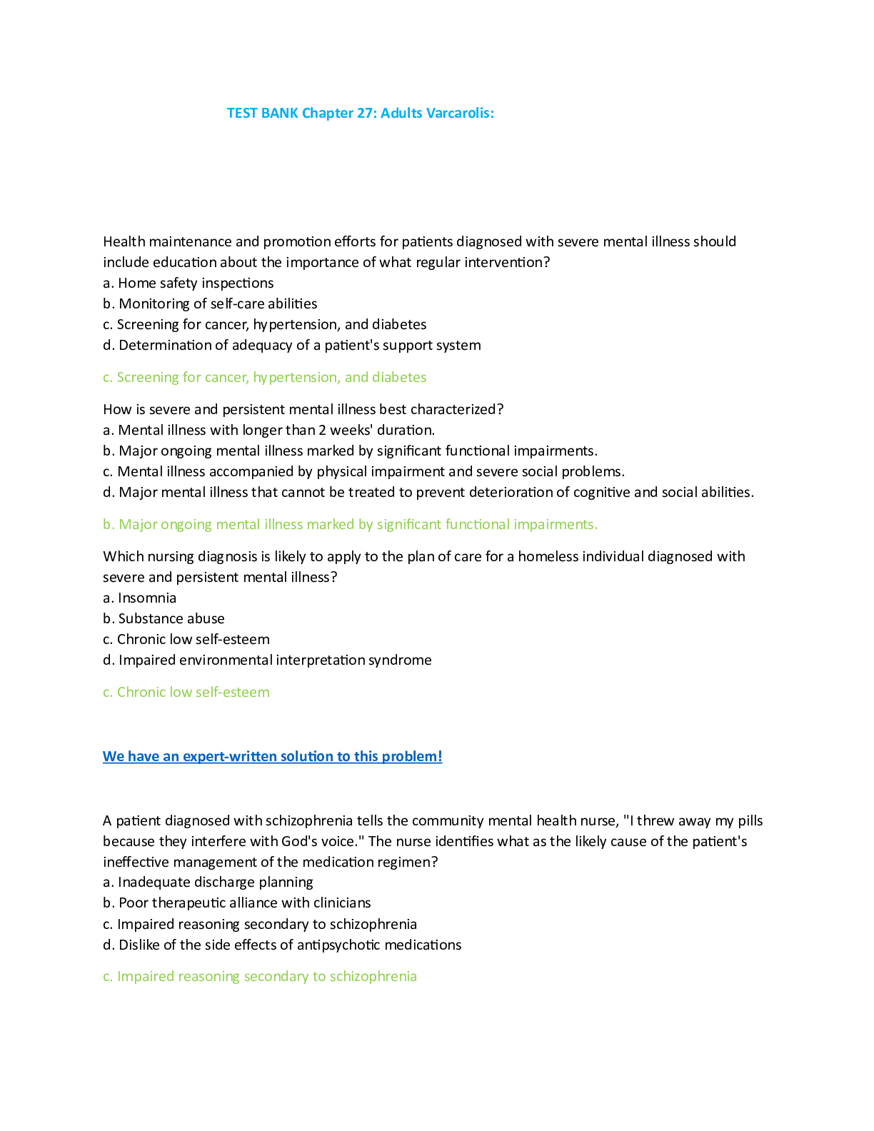 PSYCHIATRIC MENTAL HEALTH NURSING > EXAM > TEST BANK Chapter 27: Adults Varcarolis: questions and answers 100% correct 2024/2025 (All)