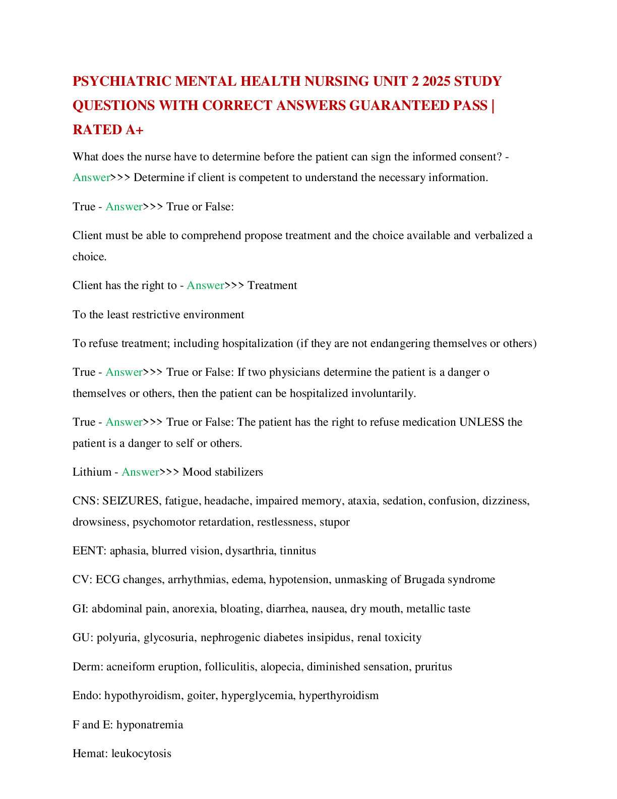 PSYCHIATRIC MENTAL HEALTH NURSING > EXAM > PSYCHIATRIC MENTAL HEALTH NURSING UNIT 2 2025 STUDY QUESTIONS WITH CORRECT ANSWERS GUARANTEED PASS | RATED A+ (All)
