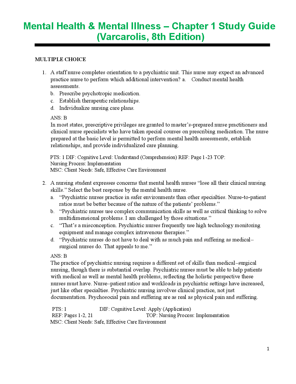 PSYCHIATRIC MENTAL HEALTH NURSING > TEST BANKS > 🧠 Mental Health & Mental Illness – Chapter 1 Study Guide (Varcarolis, 8th Edition) 🧠 (All)