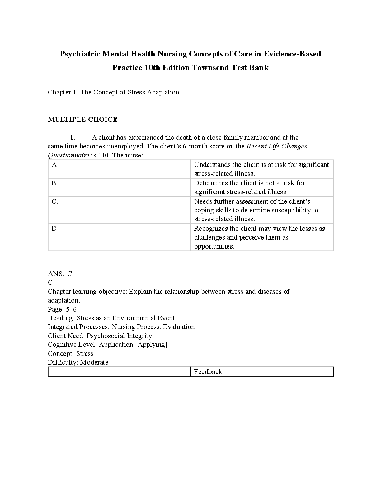 PSYCHIATRIC MENTAL HEALTH NURSING > TEST BANKS > Psychiatric Mental Health Nursing Concepts of Care in Evidence-Based Practice 10th Edition Townsend Test Bank (All)