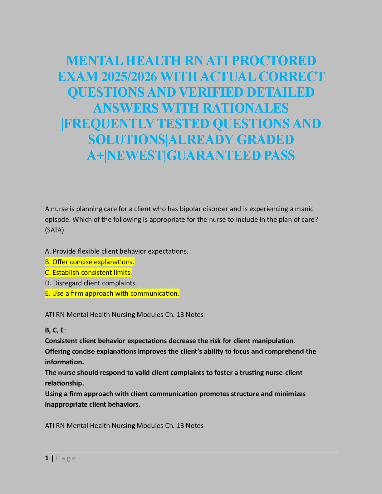 PSYCHIATRIC MENTAL HEALTH NURSING > EXAM > MENTAL HEALTH RN ATI PROCTORED EXAM (All)