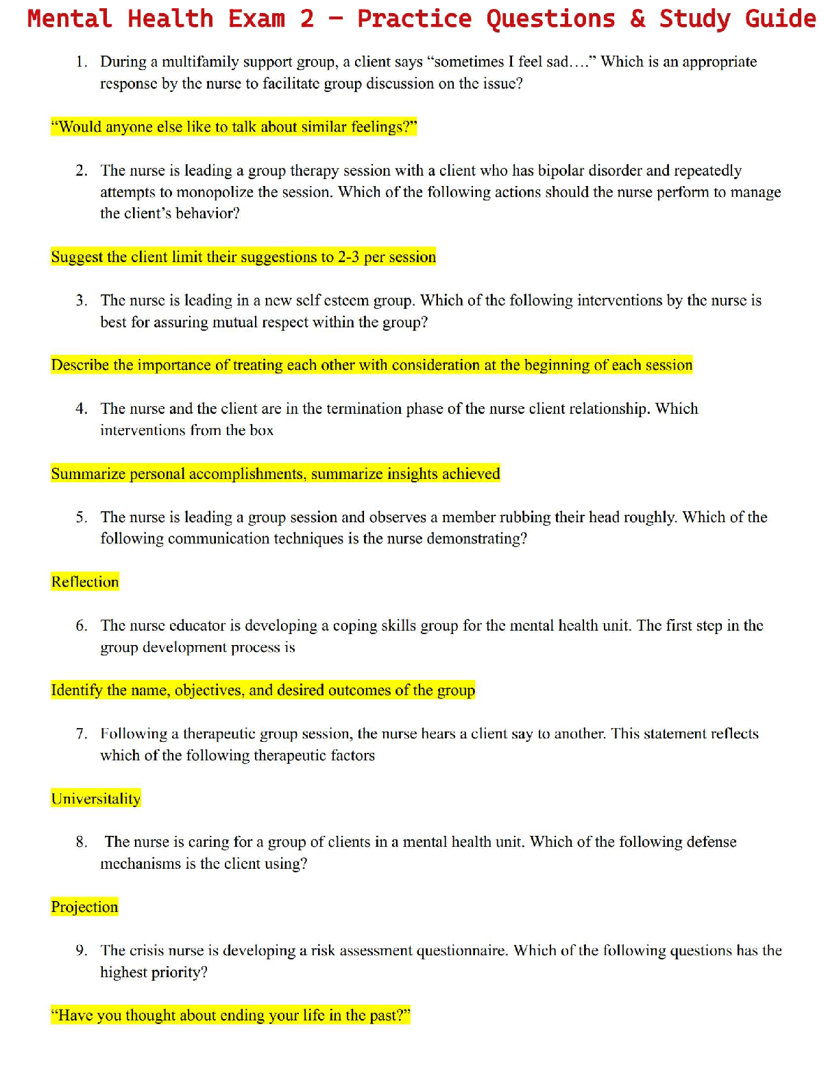 PSYCHIATRIC MENTAL HEALTH NURSING > QUESTIONS and ANSWERS > Mental Health Exam 2 – Practice Questions & Study Guide (All)