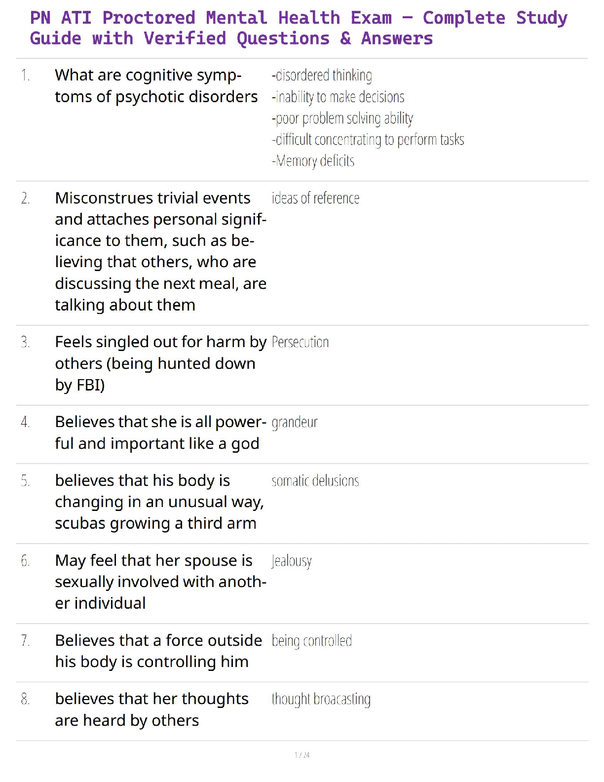 PSYCHIATRIC MENTAL HEALTH NURSING > QUESTIONS and ANSWERS > PN ATI Proctored Mental Health Exam – Complete Study Guide with Verified Questions & Answers (All)