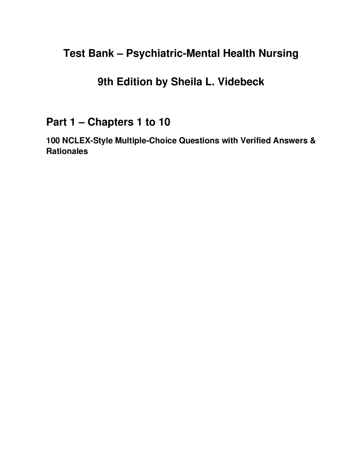 PSYCHIATRIC MENTAL HEALTH NURSING > TEST BANKS > Test Bank – Psychiatric-Mental Health Nursing 9th Edition by Sheila L. Videbeck Part 1 – Chapters 1 to 10 100 NCLEX-Style Multiple-Choice Questions with Verified Answers & Rationales (All)
