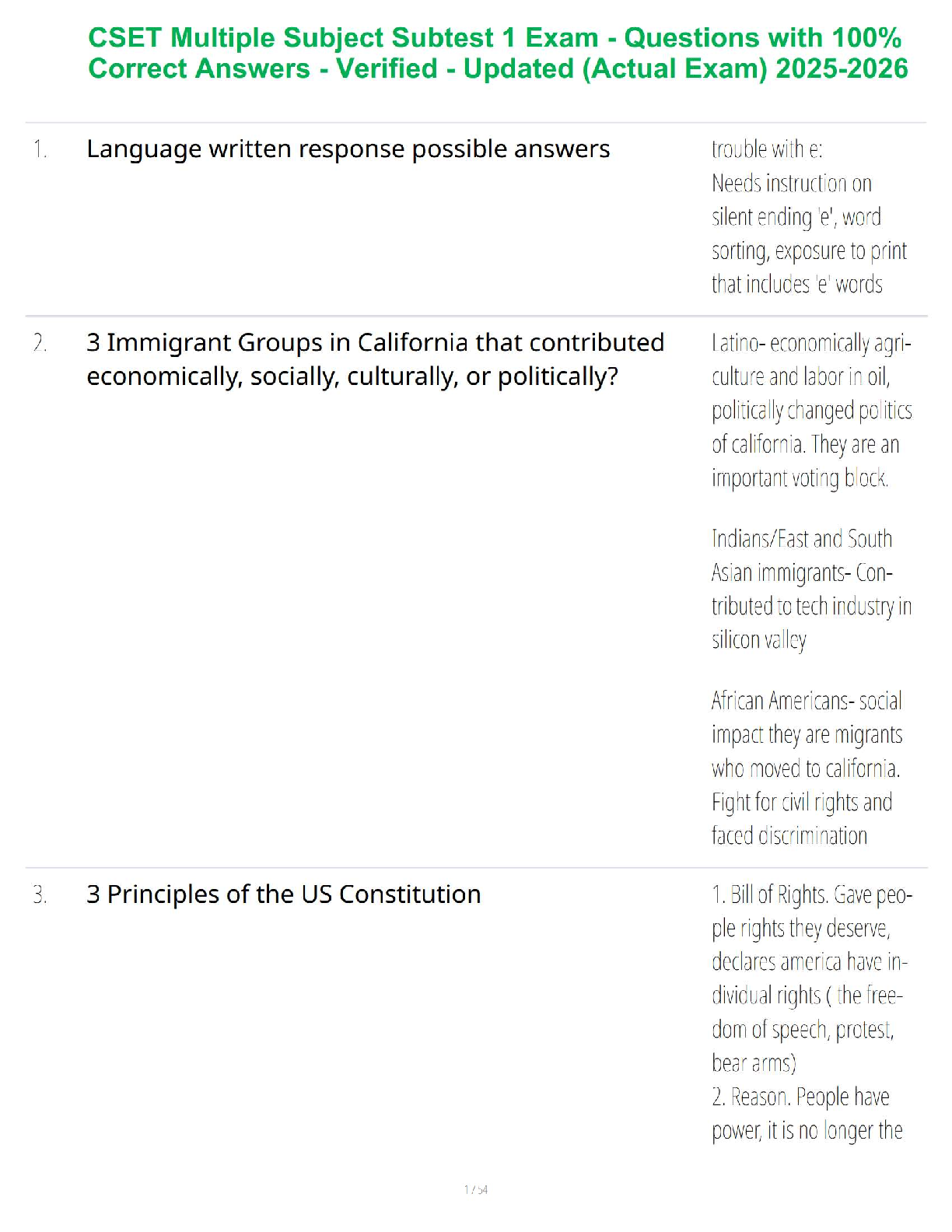 Professional Teaching Knowledge > QUESTIONS & ANSWERS > CSET Multiple Subject Subtest 1 Exam - Questions with 100% Correct Answers - Verified - Updated (Actual Exam) 2025-2026 (All)