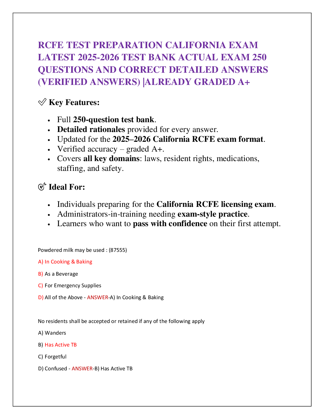 A321 KSV > EXAM > RCFE TEST PREPARATION CALIFORNIA EXAM LATEST 2025-2026 TEST BANK ACTUAL EXAM 250 QUESTIONS AND CORRECT DETAILED ANSWERS (VERIFIED ANSWERS) |ALREADY GRADED A+ (All)