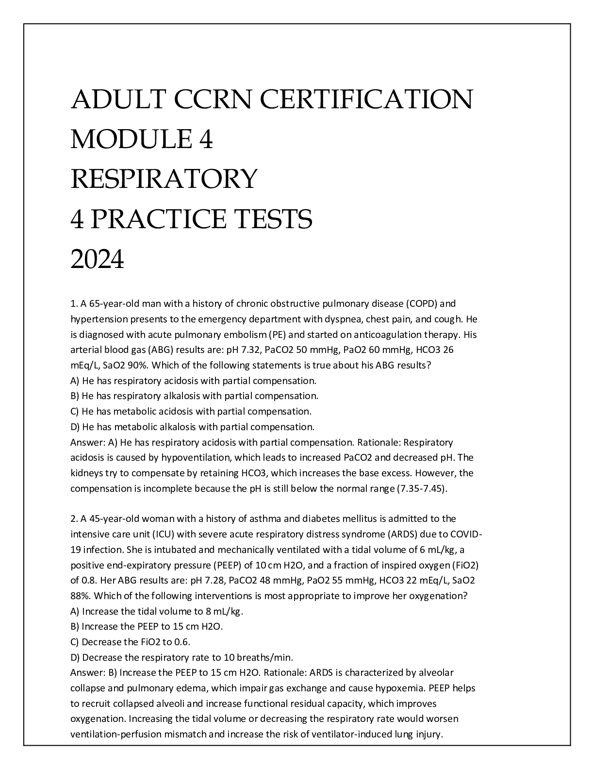 A321 KSV > EXAM > ADULT CCRN CERTIFICATION MODULE 4 RESPIRATORY 4 PRACTICE TESTS 2024 (All)