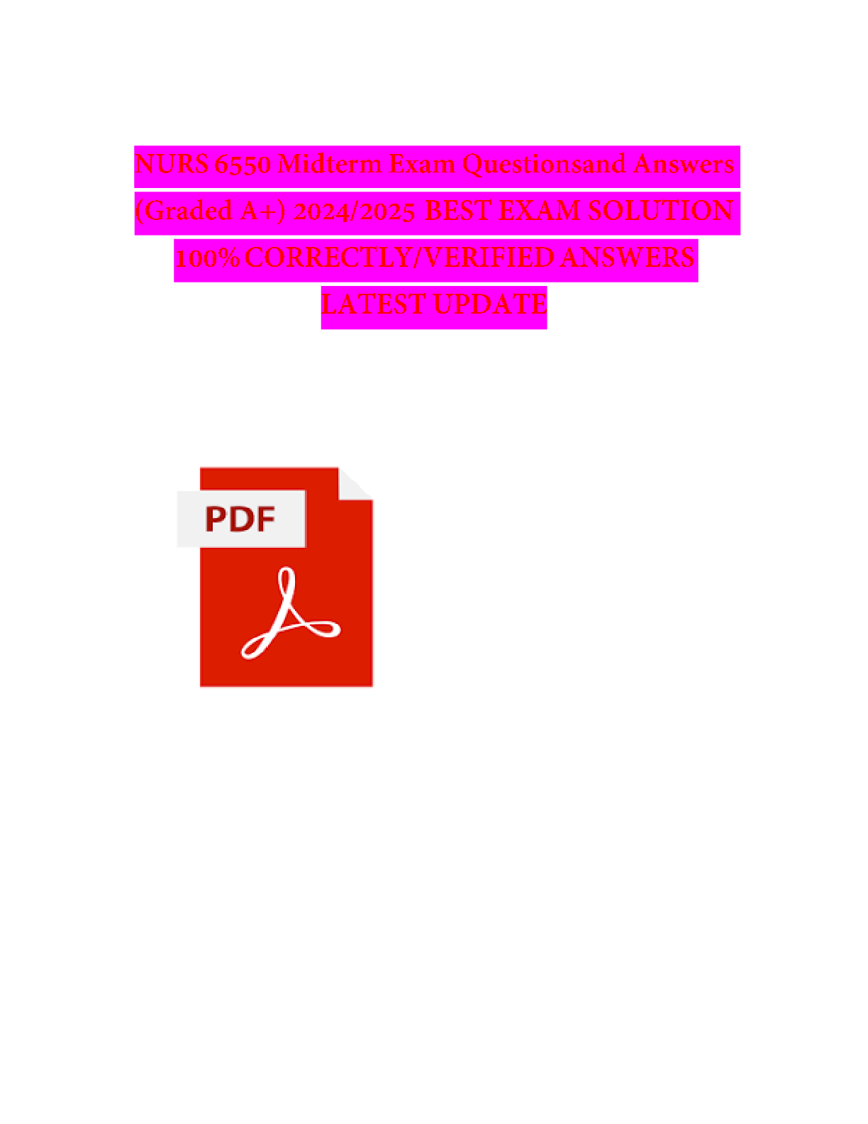 NRNP 6552 Advanced Nurse Practice > EXAM > NRNP 6550 Week 6 Midterm Exam Questions and Answers Latest (2024 / 2025) (Verified Answers) (All)