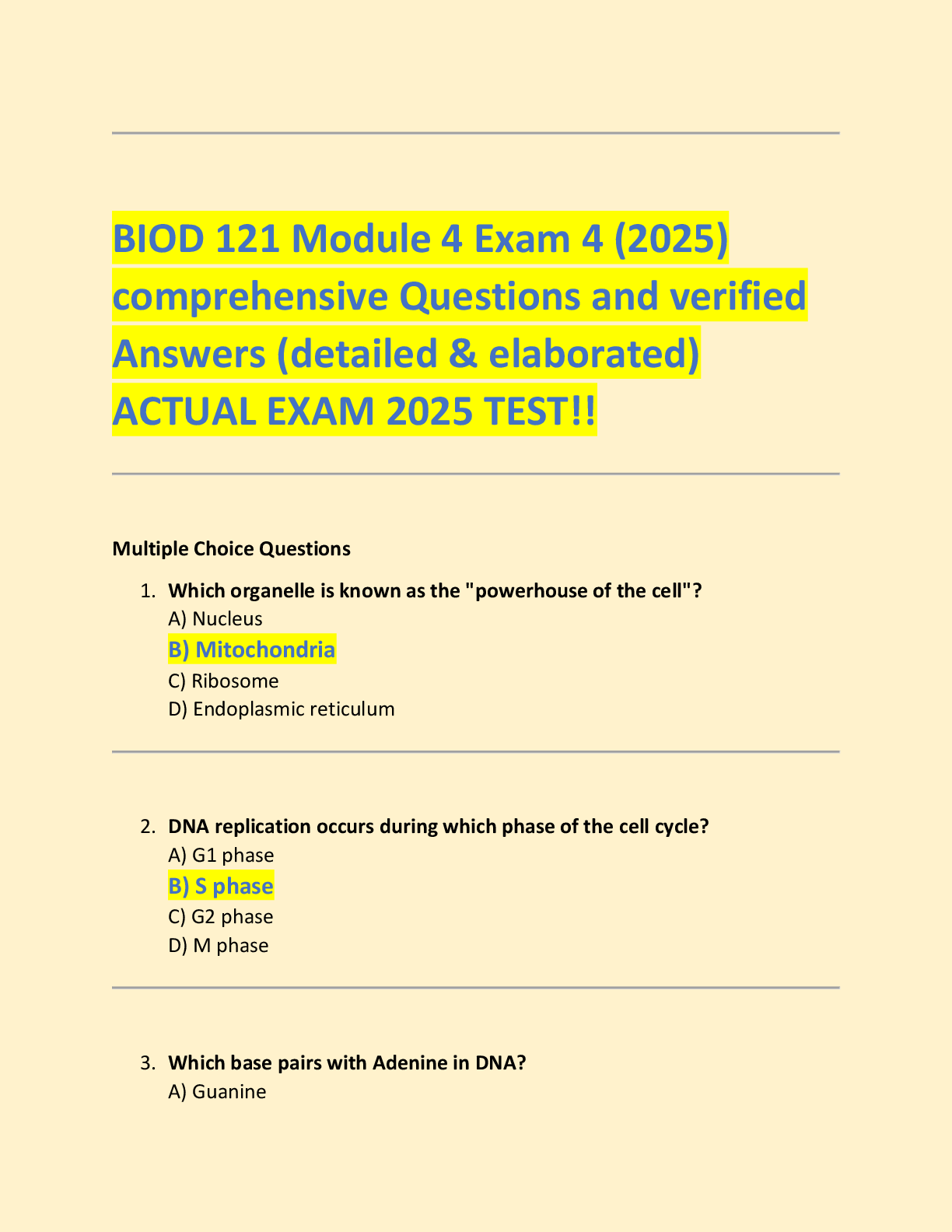 BIOD 121 > EXAM > BIOD 121 Module 4 Exam 4 (2025) comprehensive Questions and verified Answers (detailed & elaborated) ACTUAL EXAM 2025 TEST!! (All)