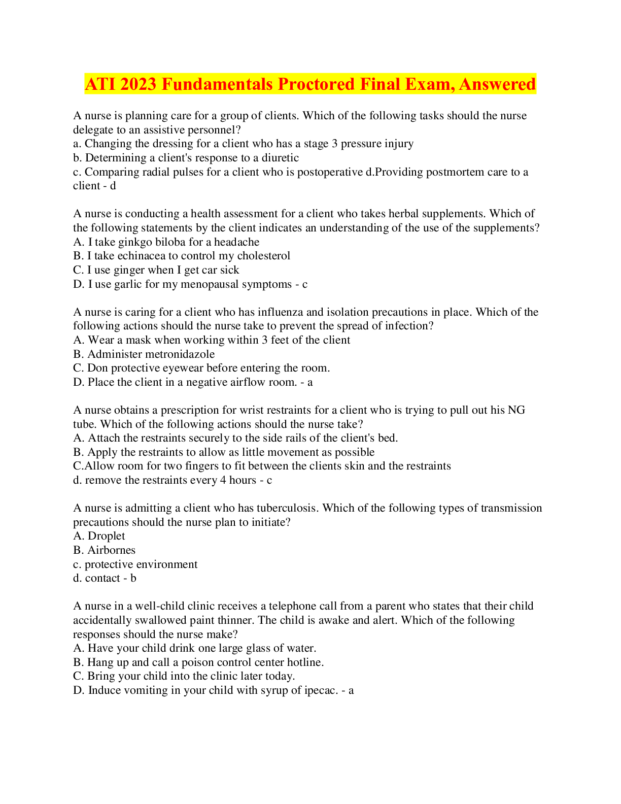 ati fundamentals > EXAM > ATI 2023 Fundamentals Proctored Final Exam, Answered (All)