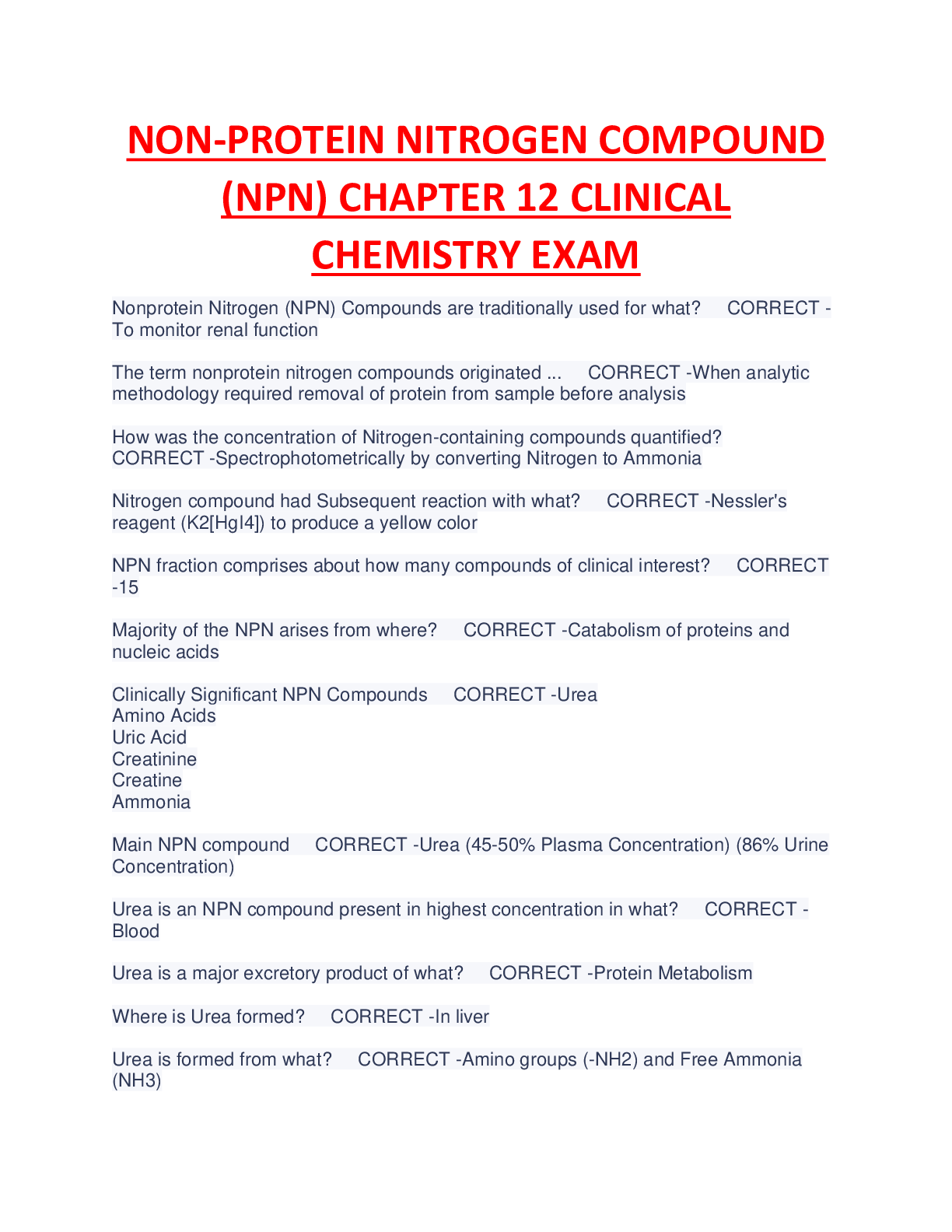 NPN > EXAM > NON-PROTEIN NITROGEN COMPOUND (NPN) CHAPTER 12 CLINICAL CHEMISTRY EXAM (All)